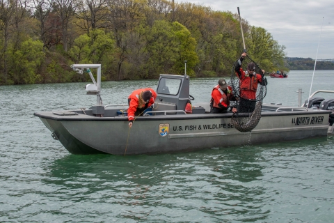 USFWS Fisheries crew in boat capturing lake sturgeon on the Niagara River.