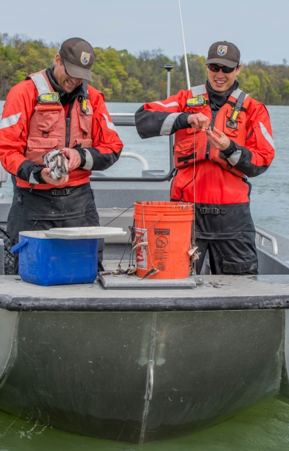 U.S. Fish and Wildlife Service fisheries crew in boat preparing for lake sturgeon field work