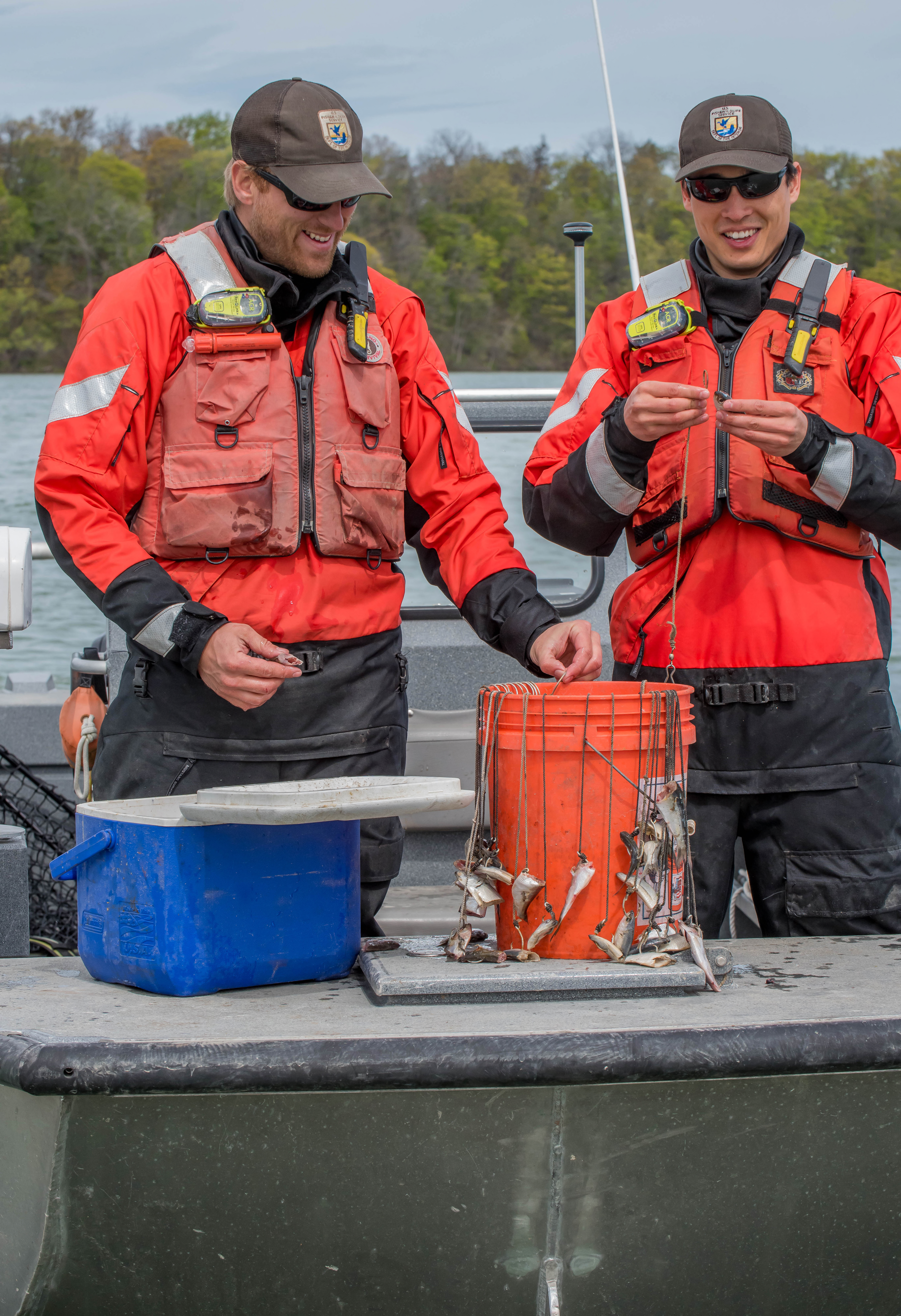 U.S. Fish and Wildlife Service fisheries crew in boat preparing for lake sturgeon field work