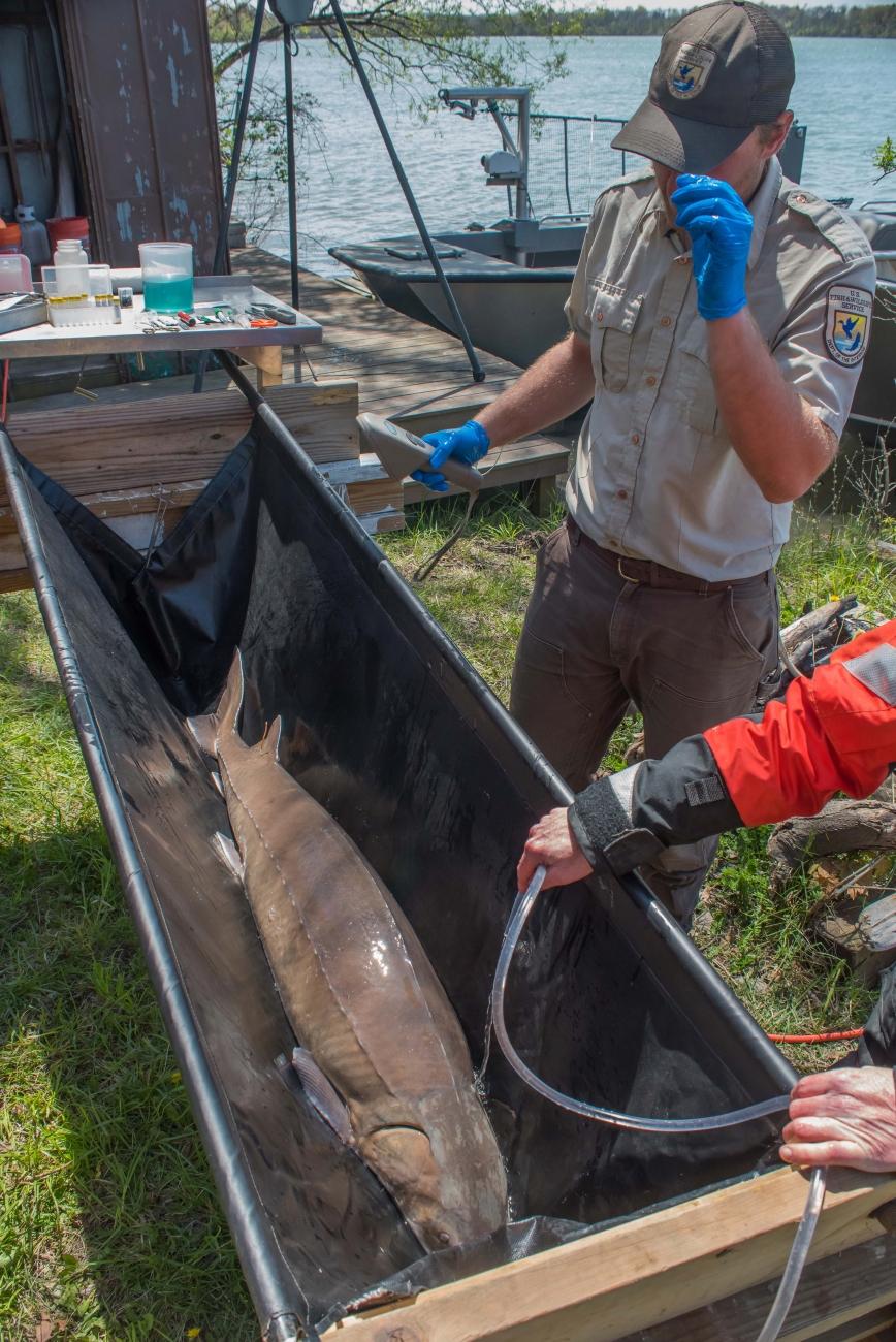 U.S. Fish and Wildlife Service fisheries crew prepares to operate on lake sturgeon