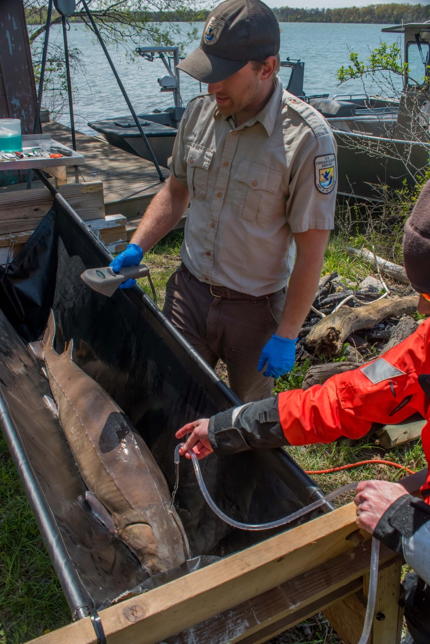 U.S. Fish and Wildlife Service fisheries crew prepares to operate on lake sturgeon