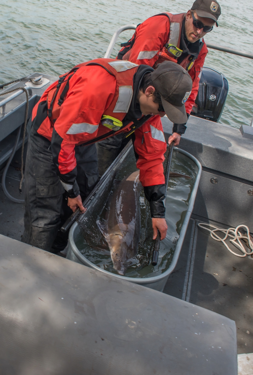 U.S. Fish and Wildlife Service fisheries crew transporting lake sturgeon