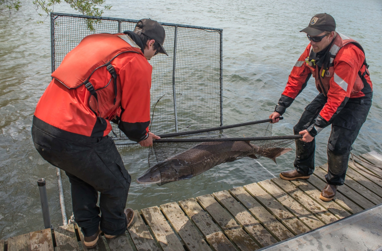 U.S. Fish and Wildlife Service fisheries crew transporting lake sturgeon