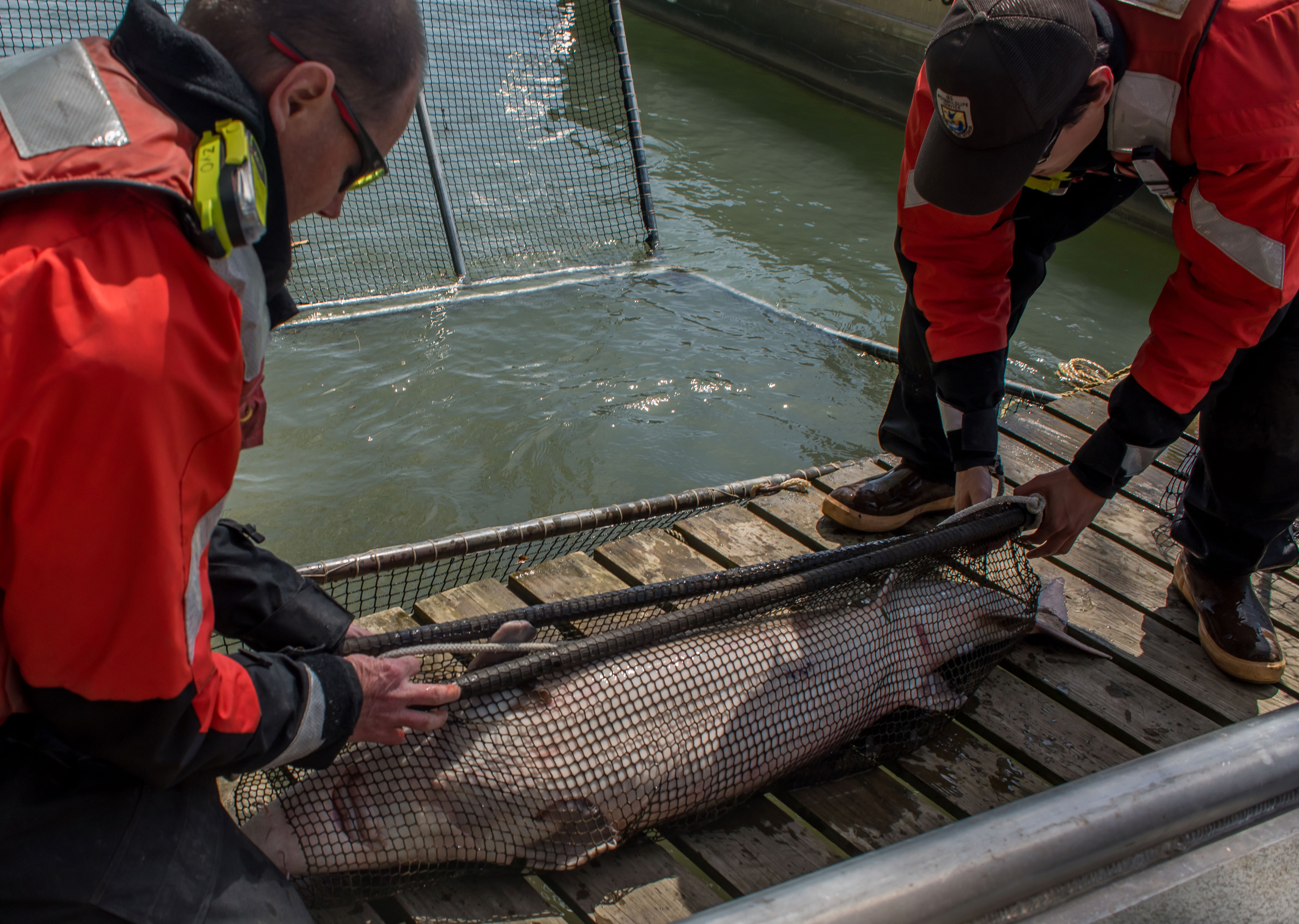USFWS Fisheries crew transporting lake sturgeon on the Niagara River.
