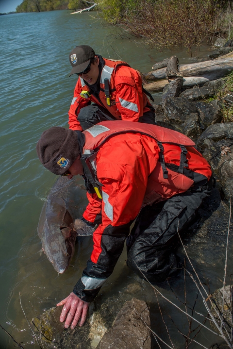 U.S. Fish and Wildlife Service fisheries crews releasing lake sturgeon