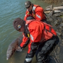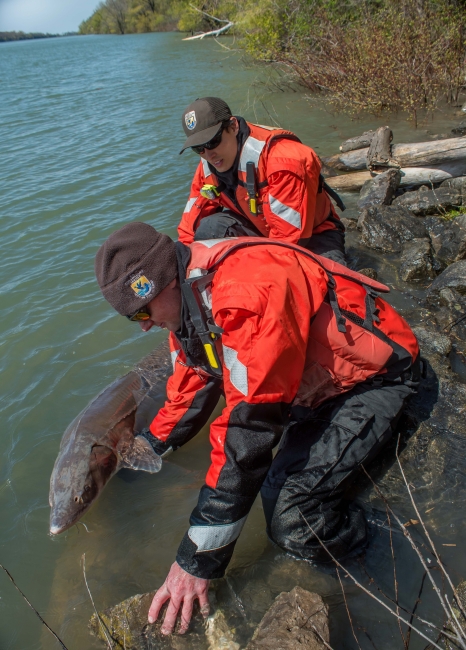 U.S. Fish and Wildlife Service fisheries crews releasing lake sturgeon
