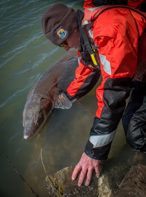U.S. Fish and Wildlife Service fisheries crews releasing lake sturgeon