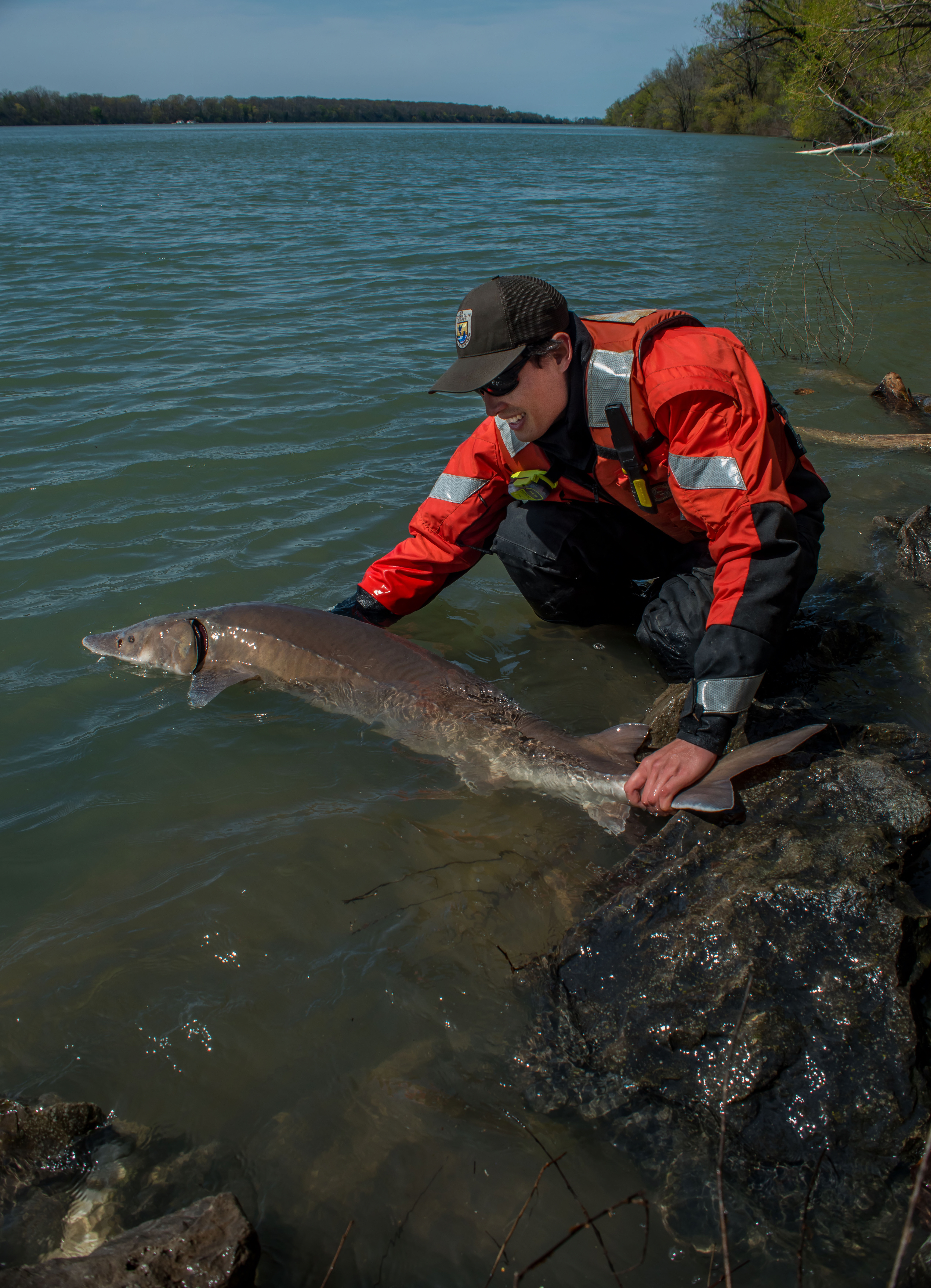 U.S. Fish and Wildlife Service fisheries crews releasing lake sturgeon