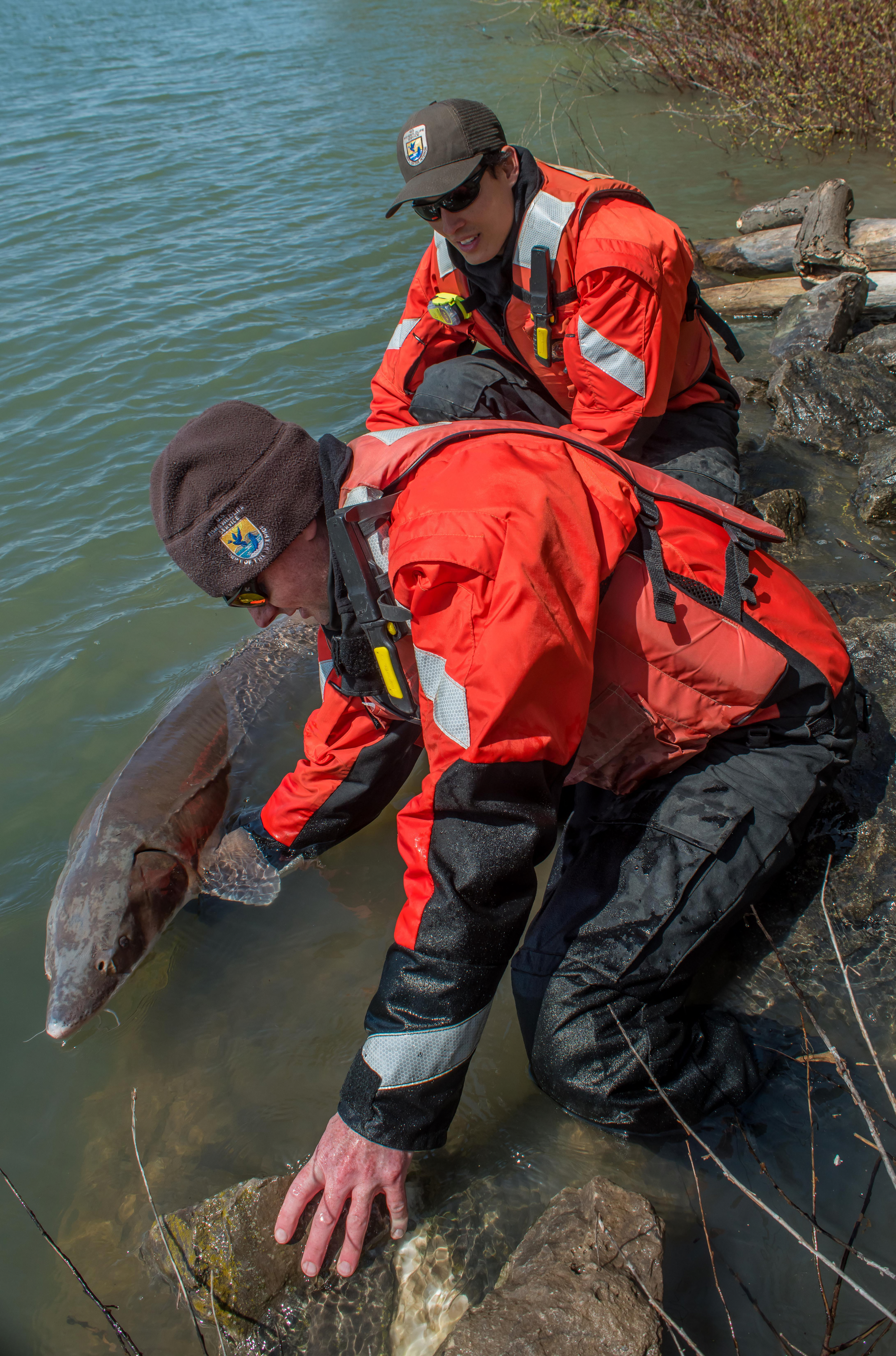 U.S. Fish and Wildlife Service fisheries crews releasing lake sturgeon