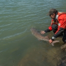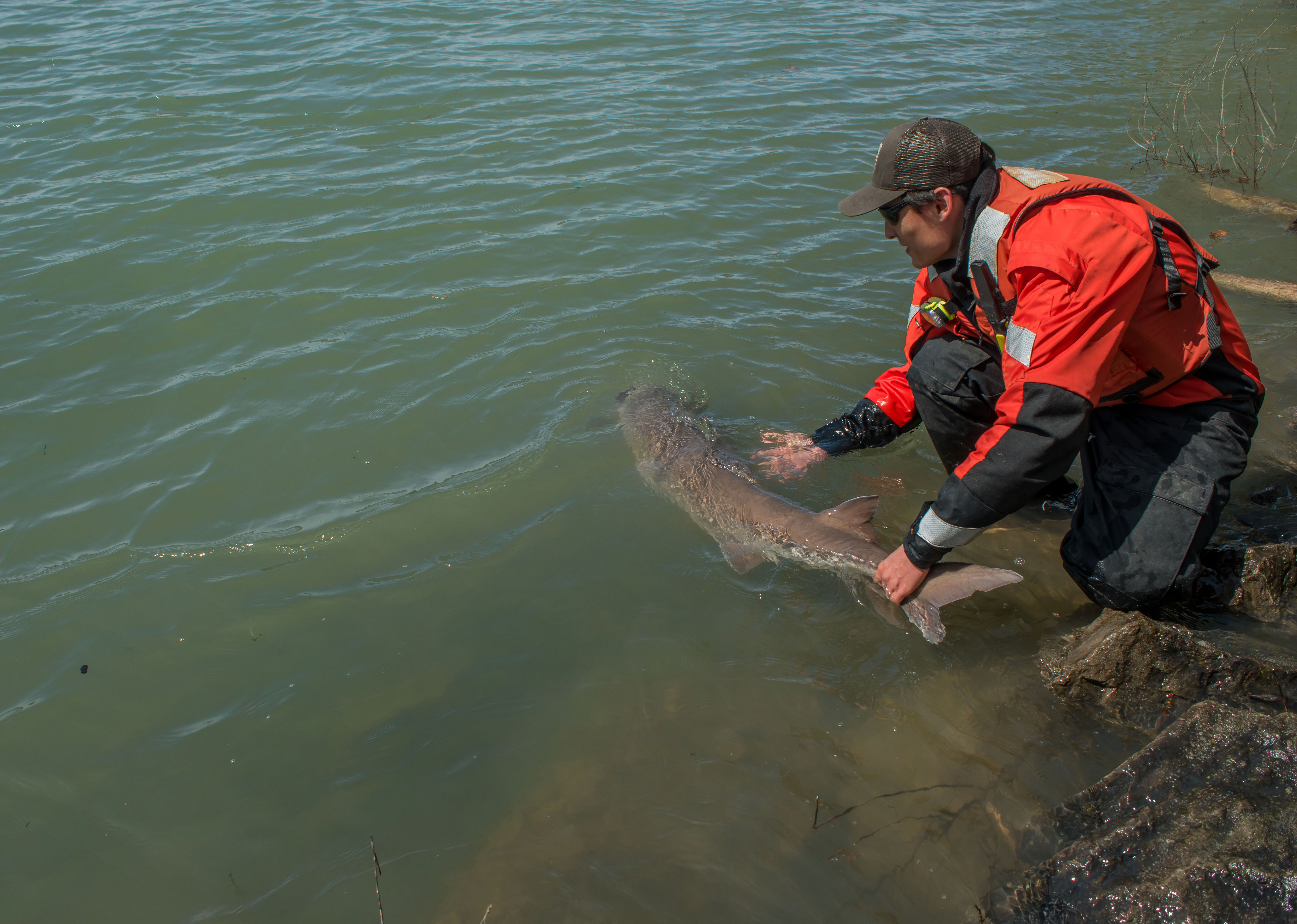 U.S. Fish and Wildlife Service fisheries crews releasing lake sturgeon