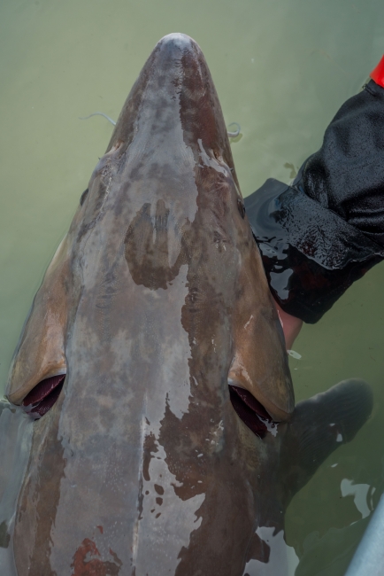 U.S. Fish and Wildlife Service fisheries worker checks lake sturgeon