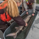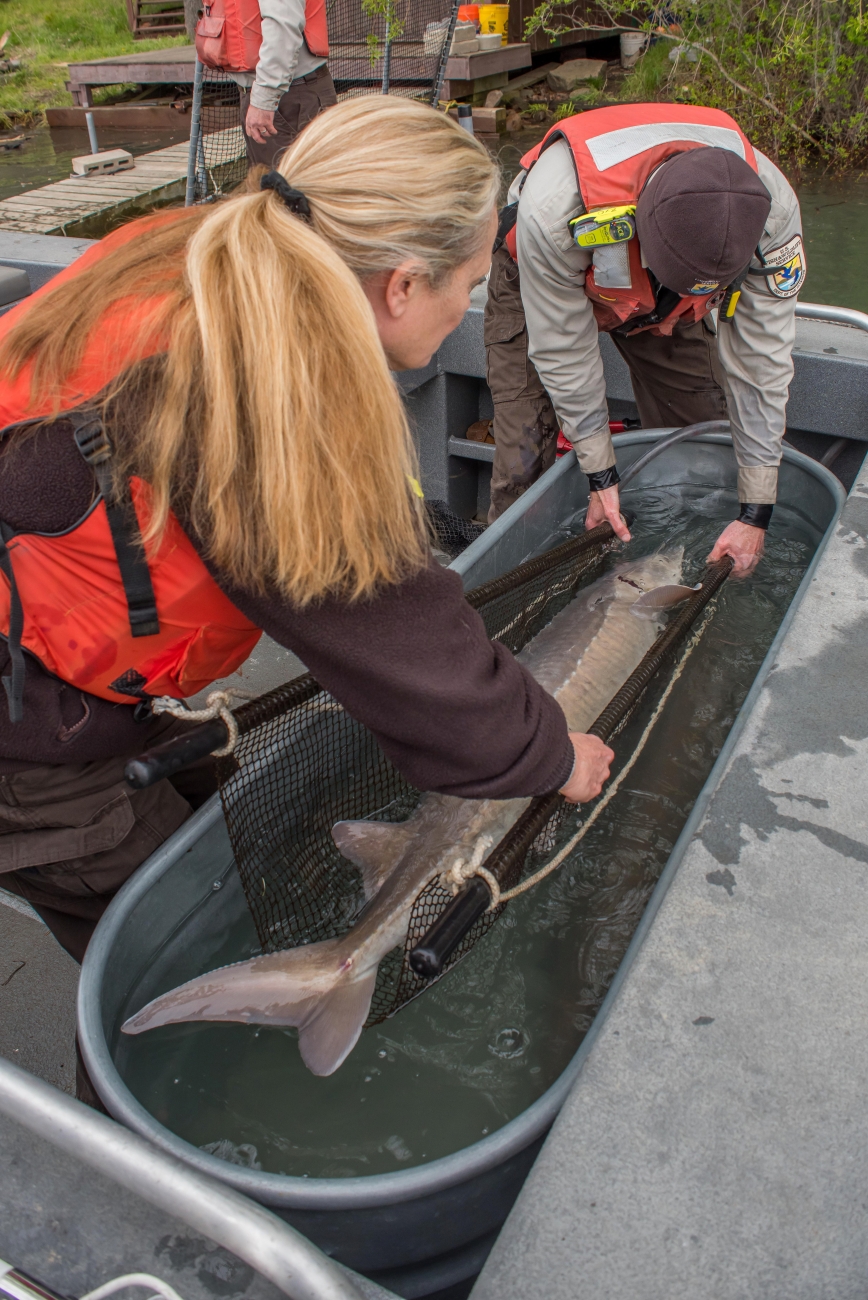 USFWS Fisheries workers prepare to move lake sturgeon to shore.