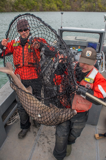 U.S. Fish and Wildlife Service fisheries workers catching lake sturgeon