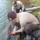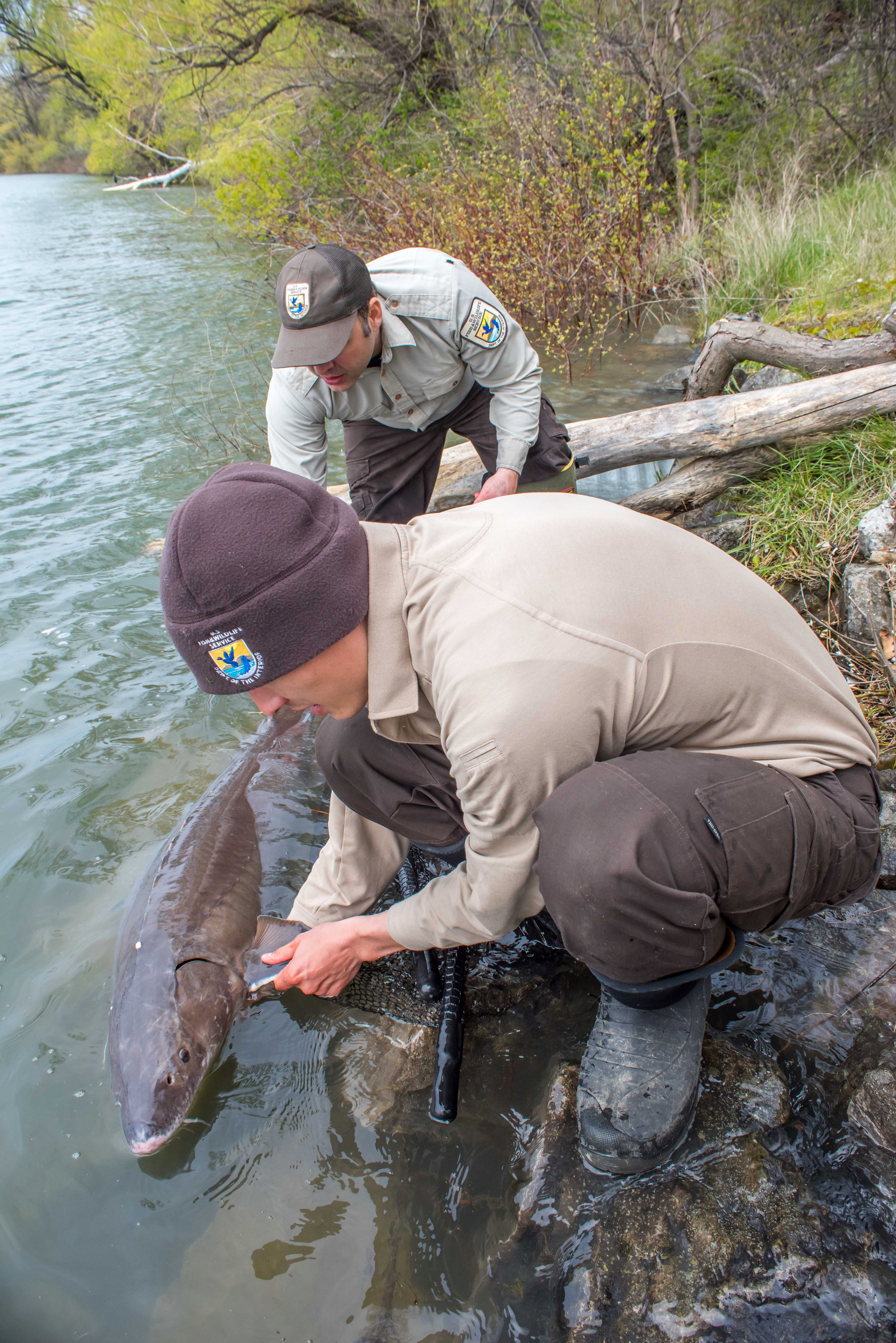USFWS Fisheries workers prepare to release Lake sturgeon
