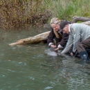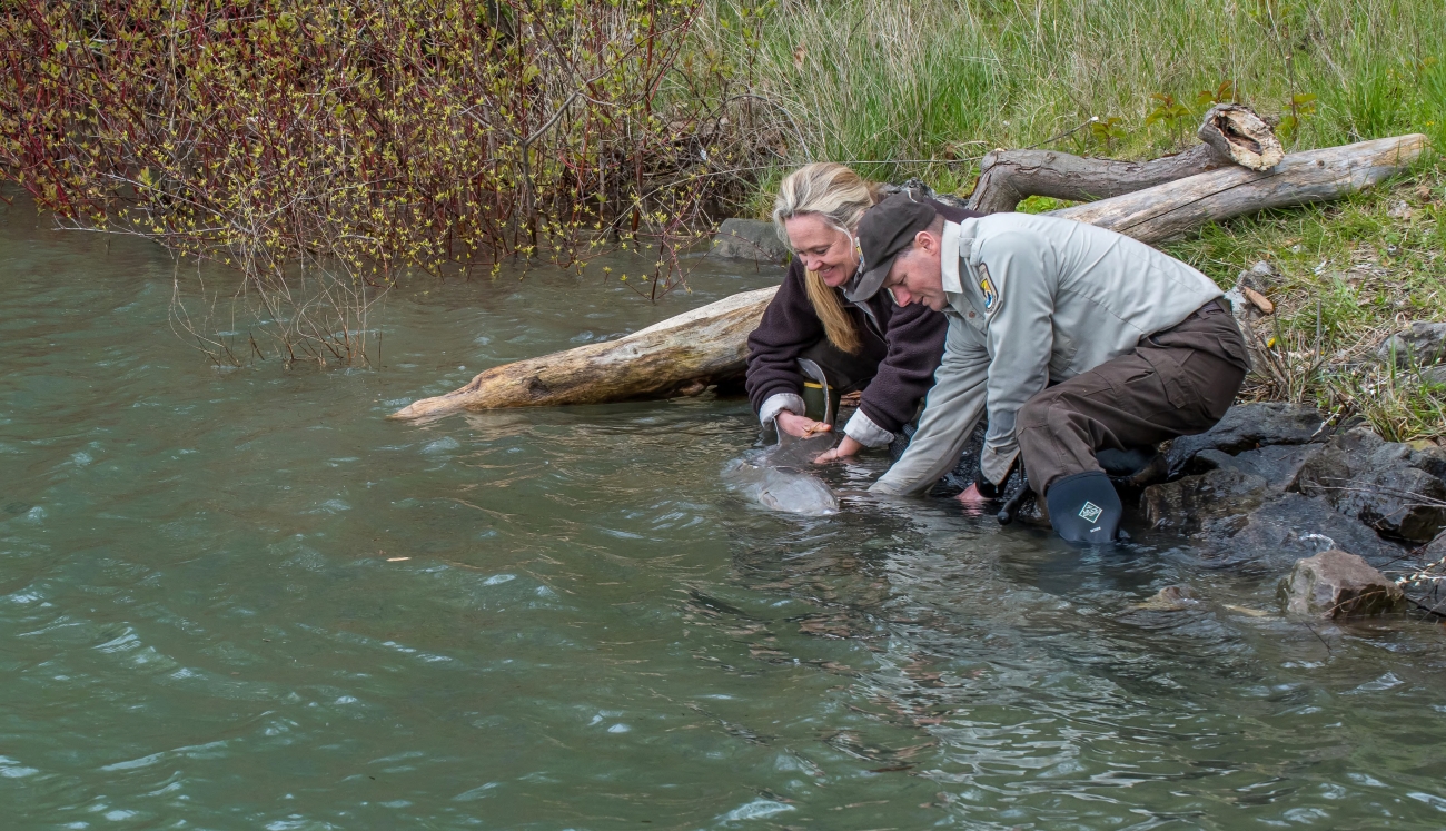 USFWS Fisheries workers release Lake sturgeon in Niagara River, New York