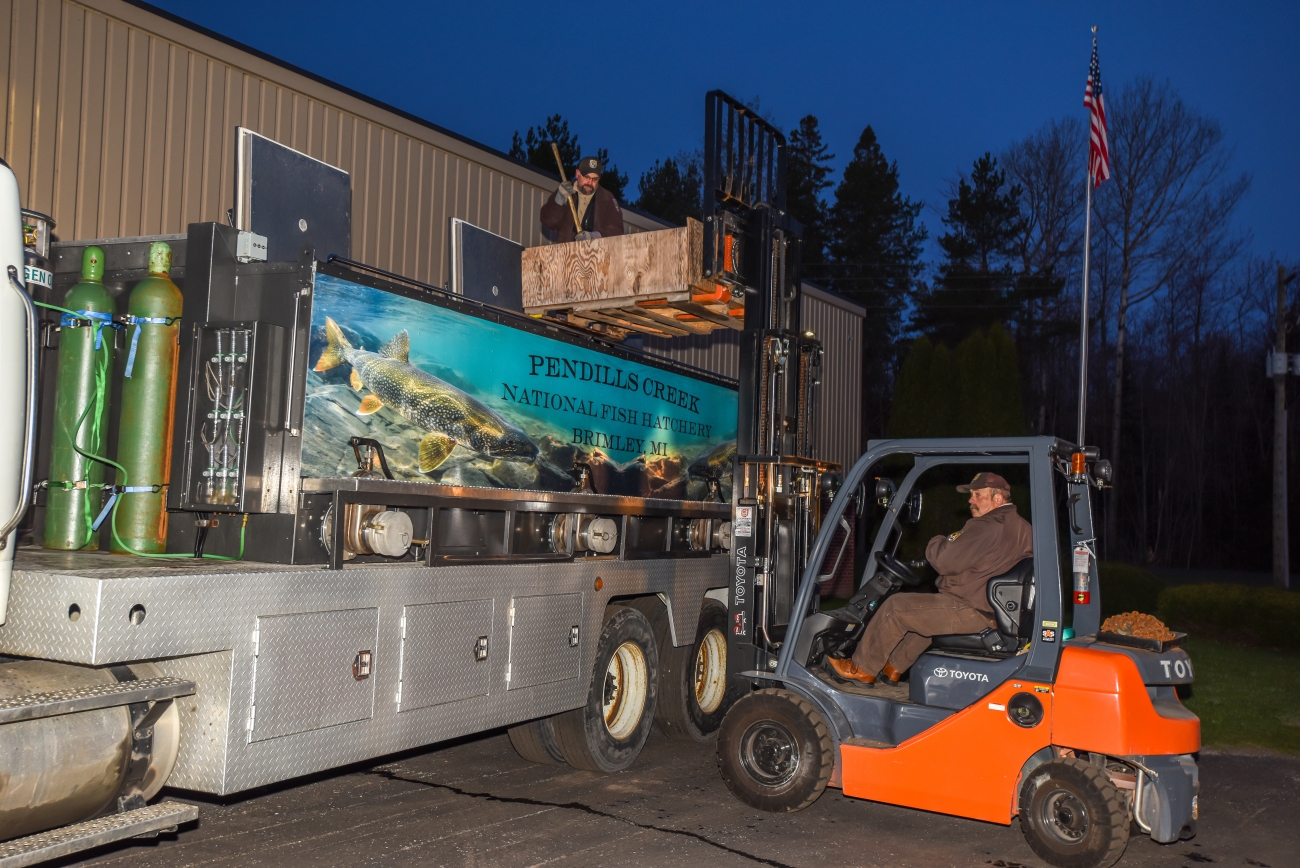 U.S. Fish and Wildlife Service loading juvenile lake trout onto hatchery trucks at Pendills Creek NFH