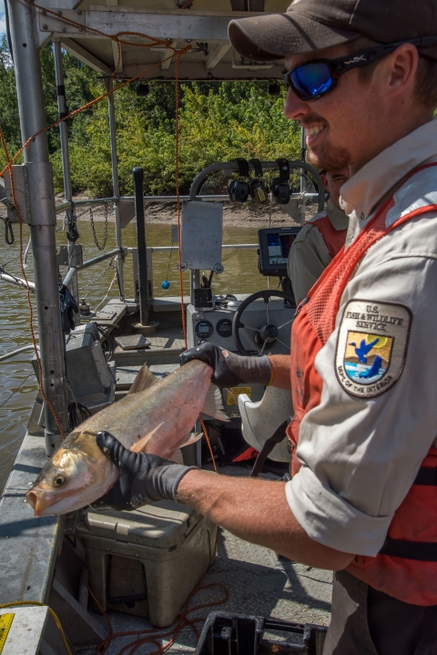 U.S. Fish and Wildlife Service worker holds invasive Silver carp