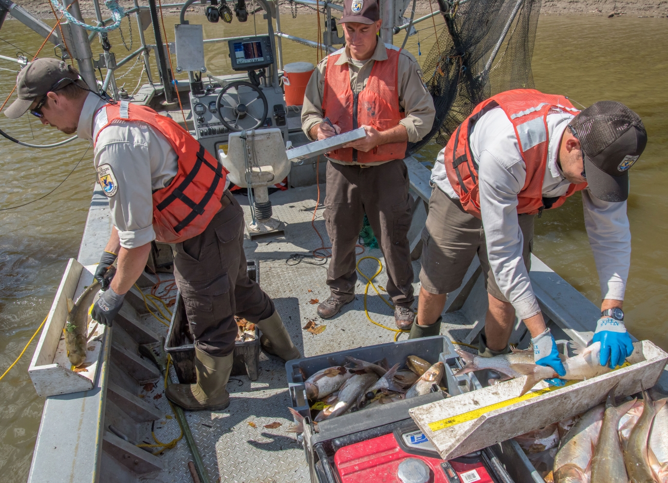 U.S. Fish and Wildlife Service workers measure invasive Silver carp