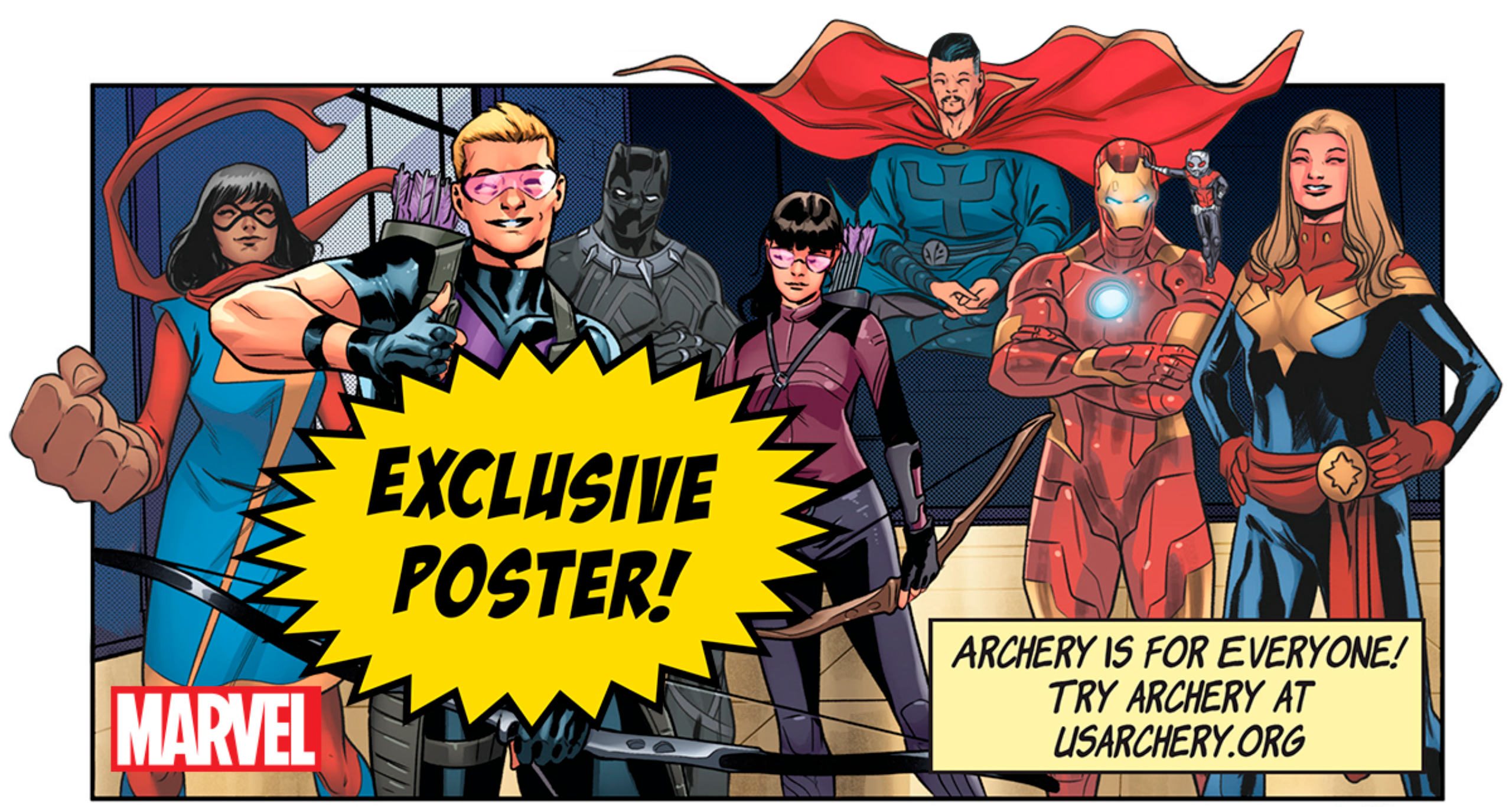 Hawkeye and other Marvel superheroes in comic strip style poster promoting the Archery is for Everyone! campaign.