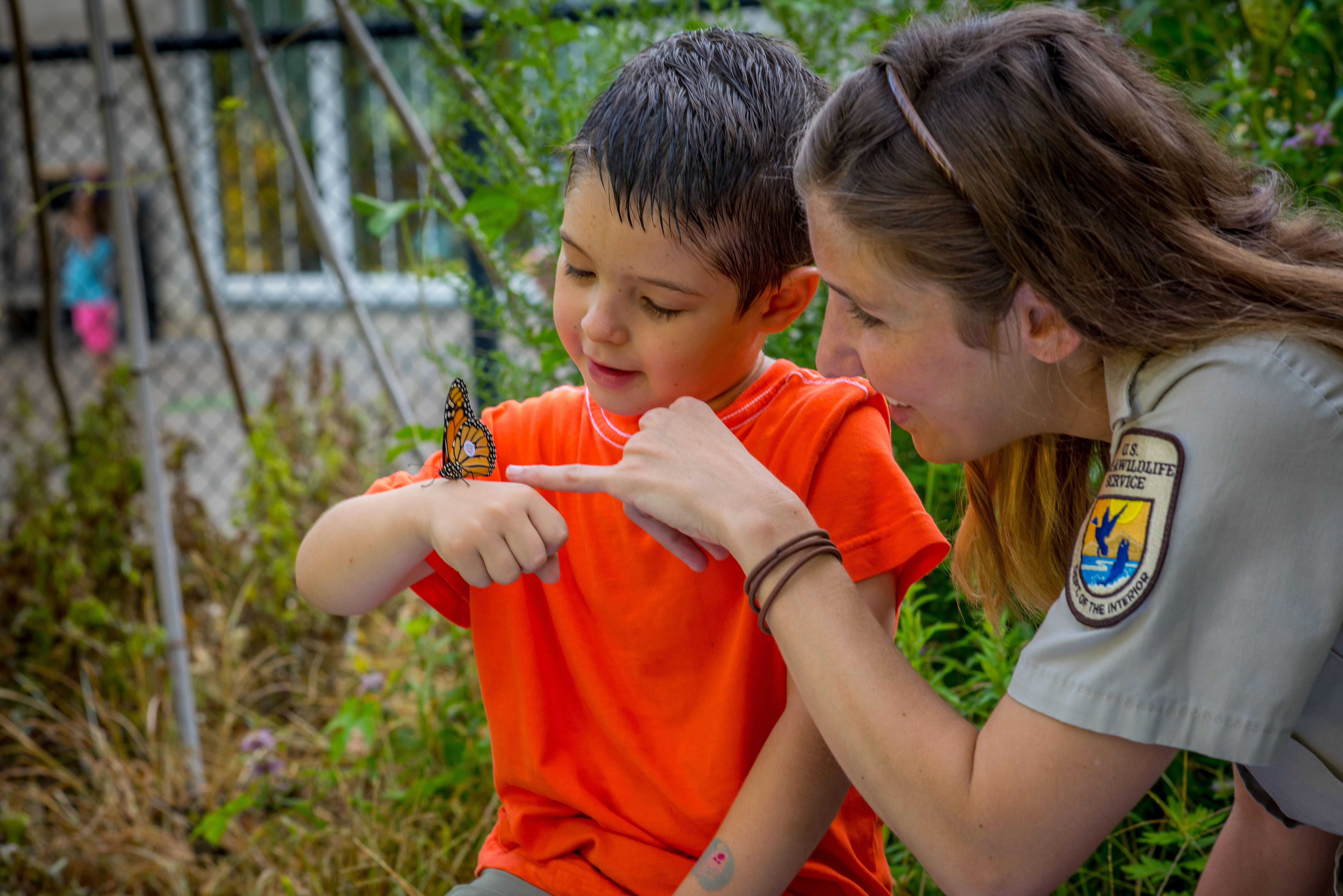 U.S.Fish and Wildlife Service employee shows child tagged monarch