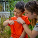 FWS employee and little boy look at tagged monarch