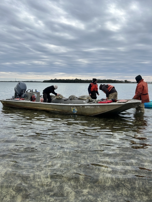 USFWS and USGS staff/volunteers are loading up a USFWS boat with cold stunned green sea turtles.