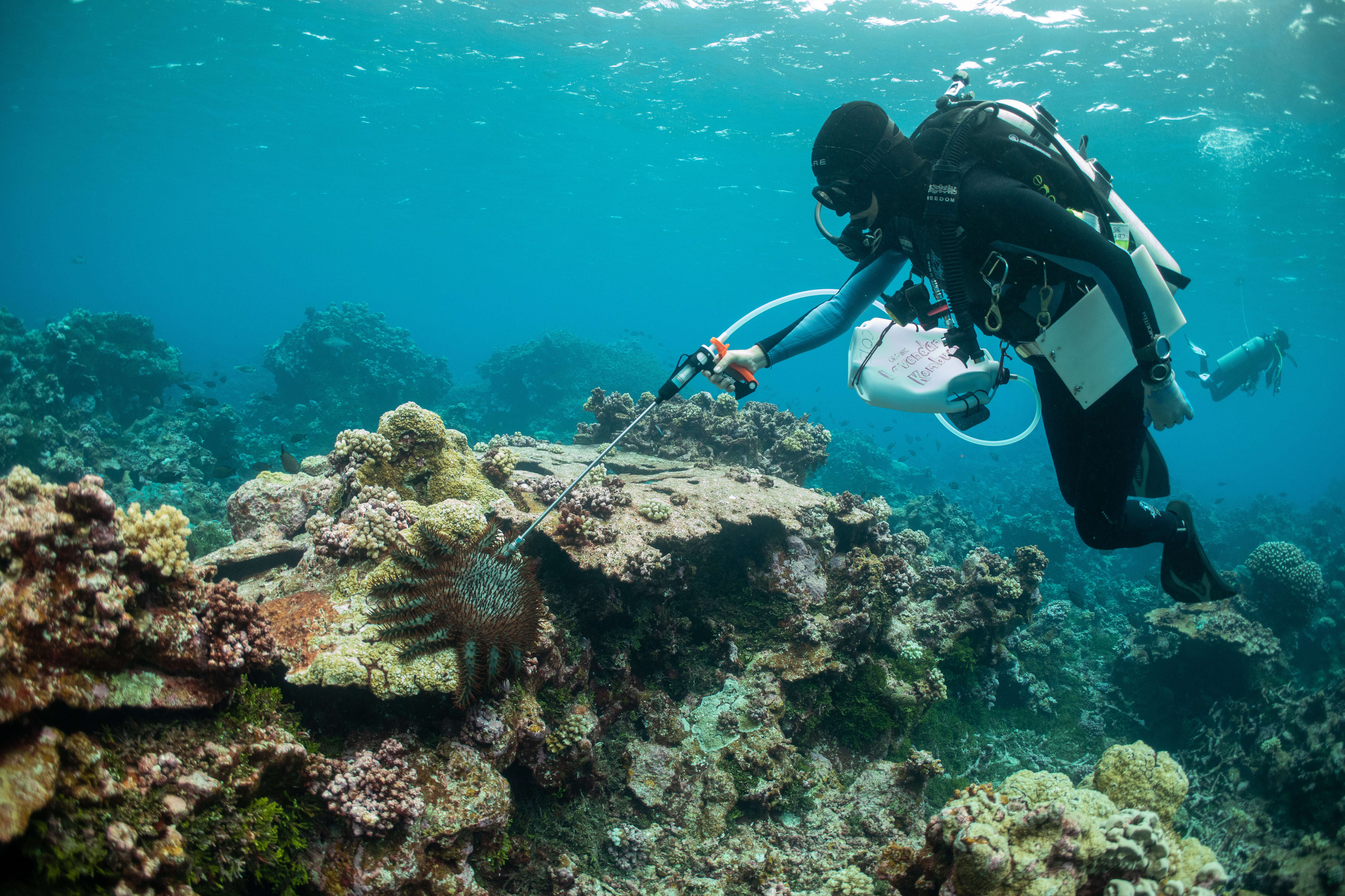 Members of a U.S. Fish and Wildlife Service dive team search the coral reef of Palmyra Atoll National Wildlife Refuge for crown-of-thorns starfish, April 17, 2023.