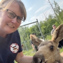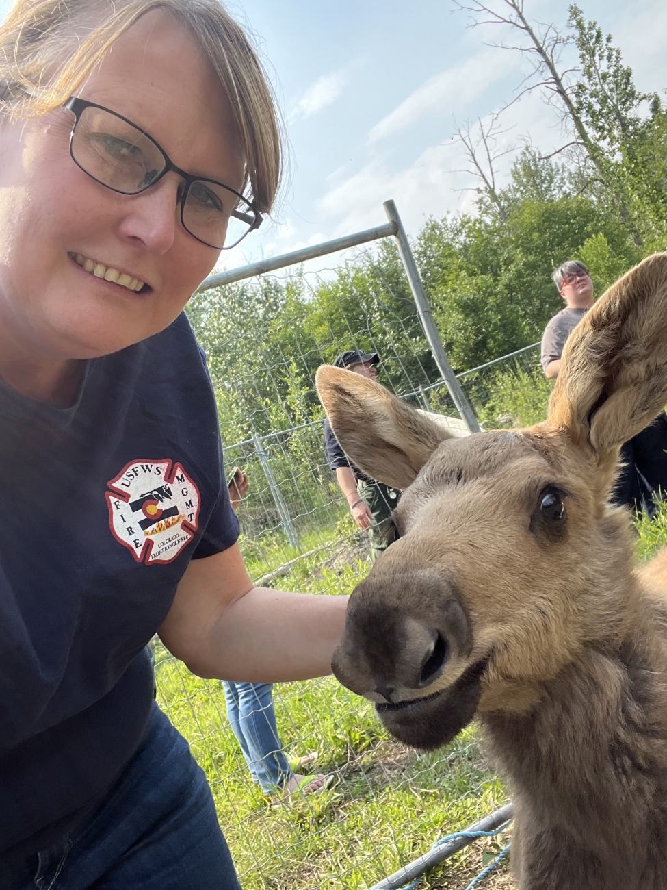 USFWS employee Shawna Martinez takes a selfie with a baby moose at a a animal rescue/sanctuary in Canada while assisting with fire suppression efforts