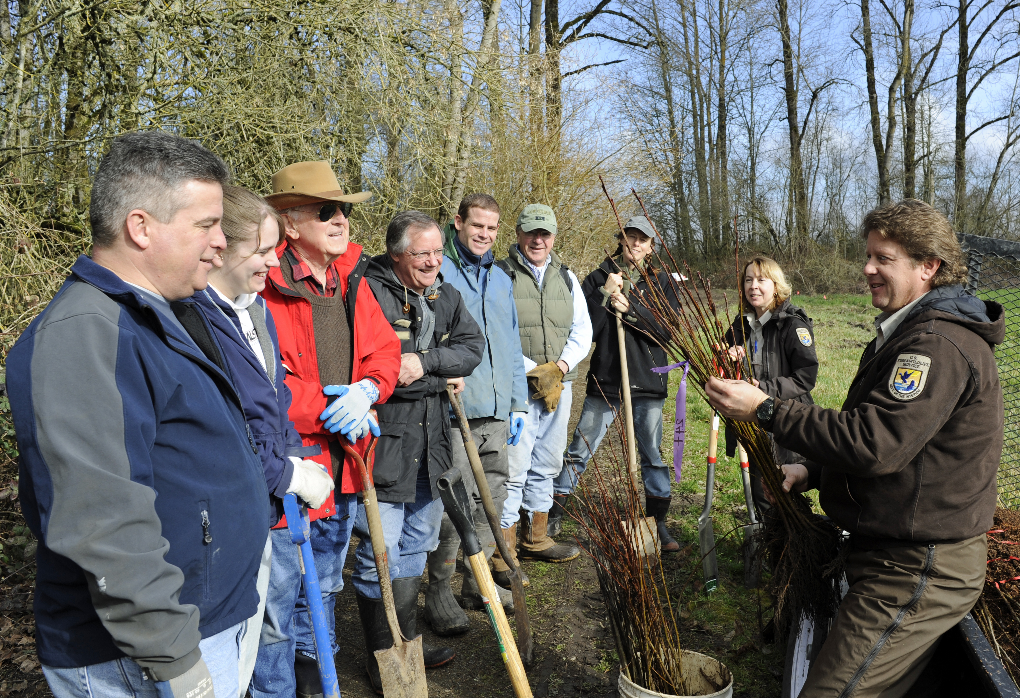 USFWS - Willamette Valley National Wildlife Refuge Complex staff and volunteers huddled around each other during tree planting event.