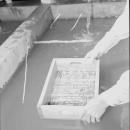 Original caption: Grading box, used for grading Bass for size. By dipping up and down in the water, the smaller fish go through the open slots in the bottom of box. Tishomingo National Fish Hatchery, Oklahoma, May 1949.