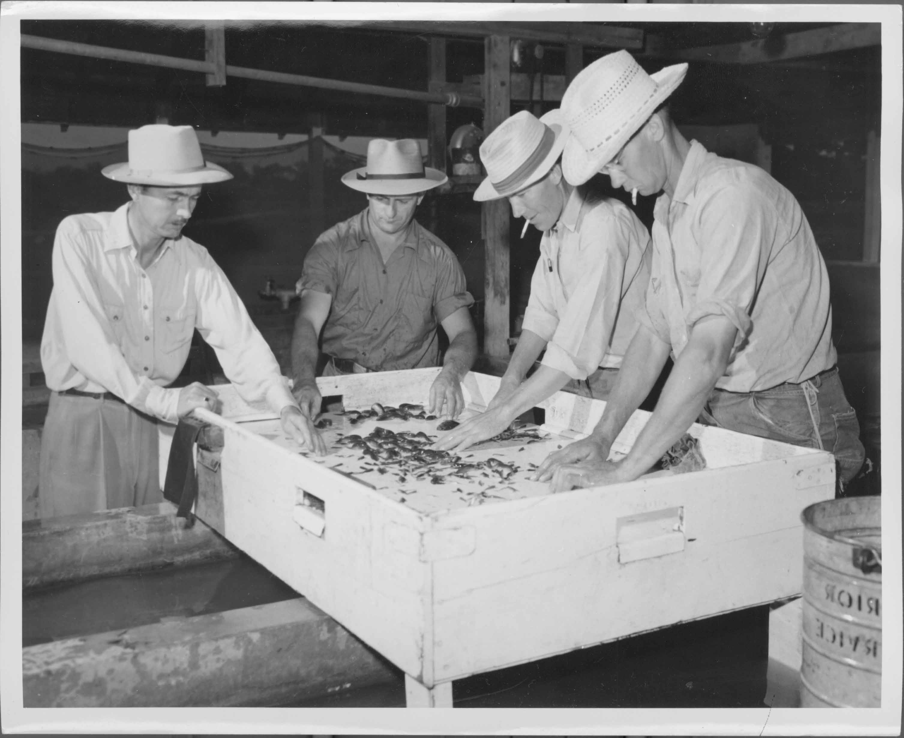 Original caption: Sorting table used in the hatchery for sorting fish as they are taken from ponds. Each slot opening in the table's sides and ends permits fish and culls to be slid out into four different tanks, cans or other containers. Personnel in photo, Left to right J.C. Standifer, W.O. Cox, Glenn F. Adams, Foreman, and Hubert C. Topel, hatchery superintendent. Tishomingo National Fish Hatchery, Oklahoma. May 1949.