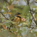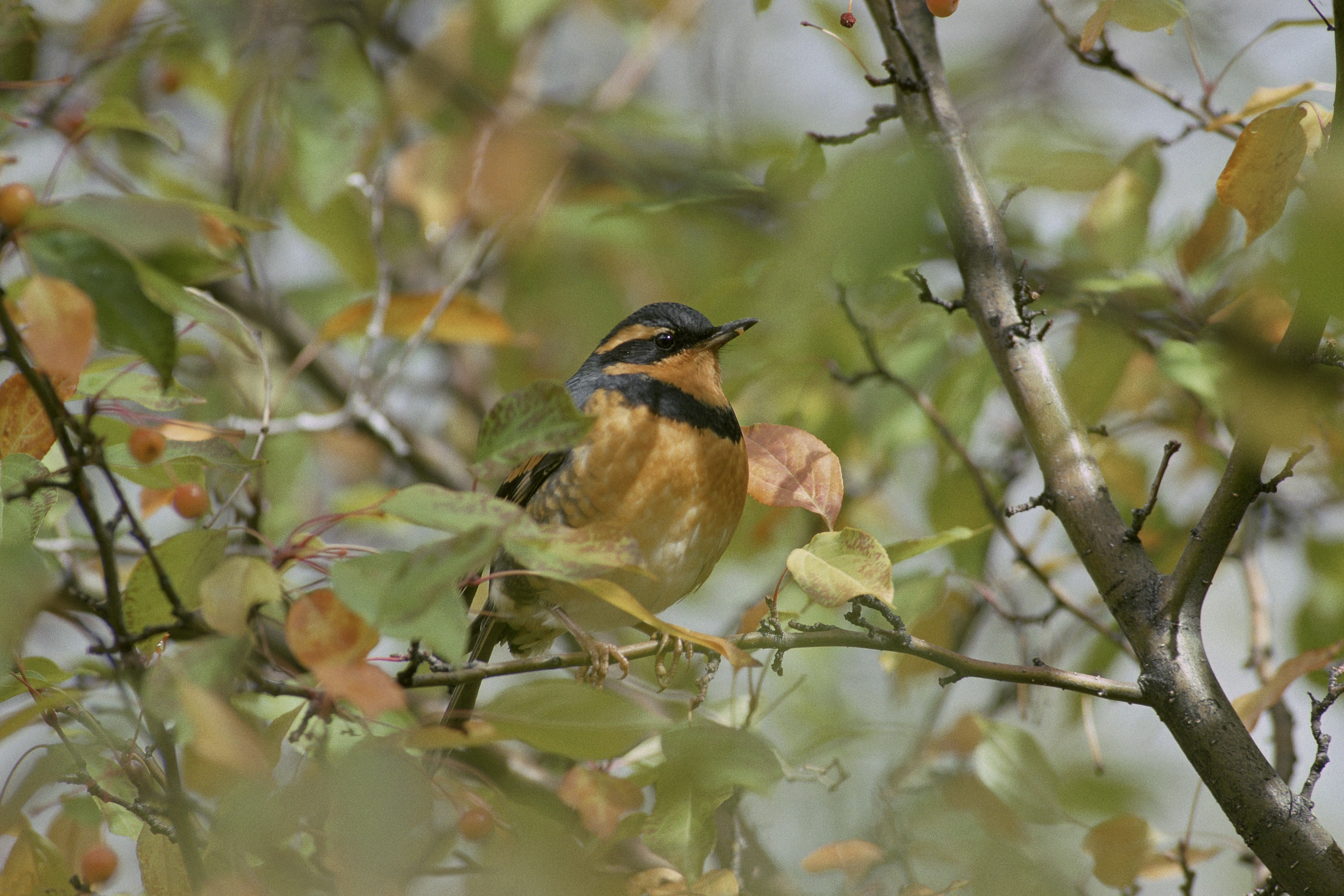 A view of a Varied Thrush perched on a branch near the visitor center at the Tule Lake National Wildlife Refuge located in California.