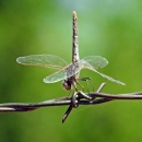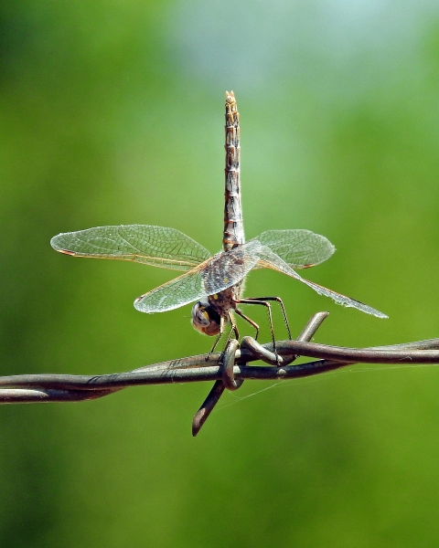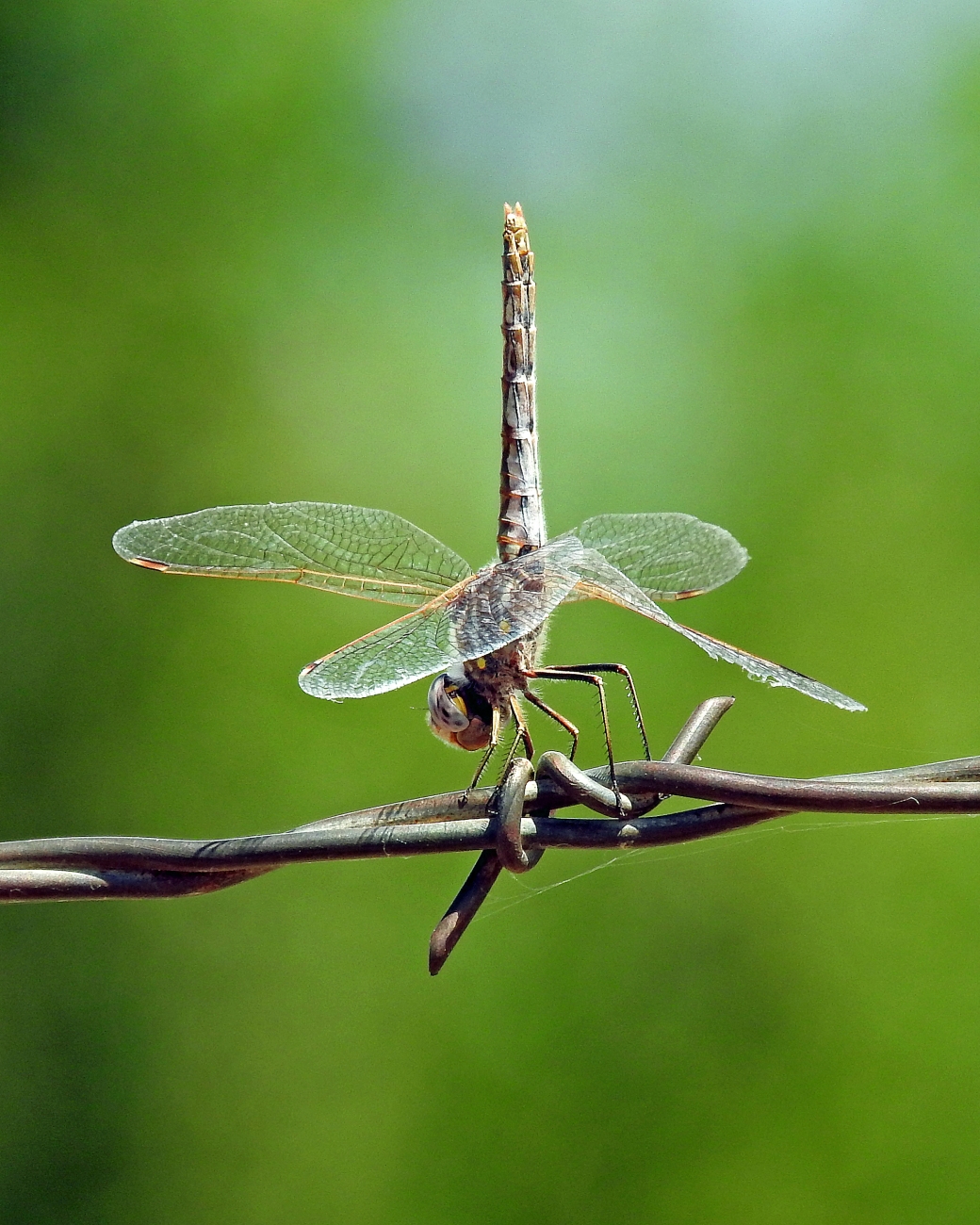 2017 Valle de Oro Photo Contest Grand Prize. Variegated meadowhawk dragonfly balancing upside down on barbed wire.