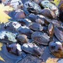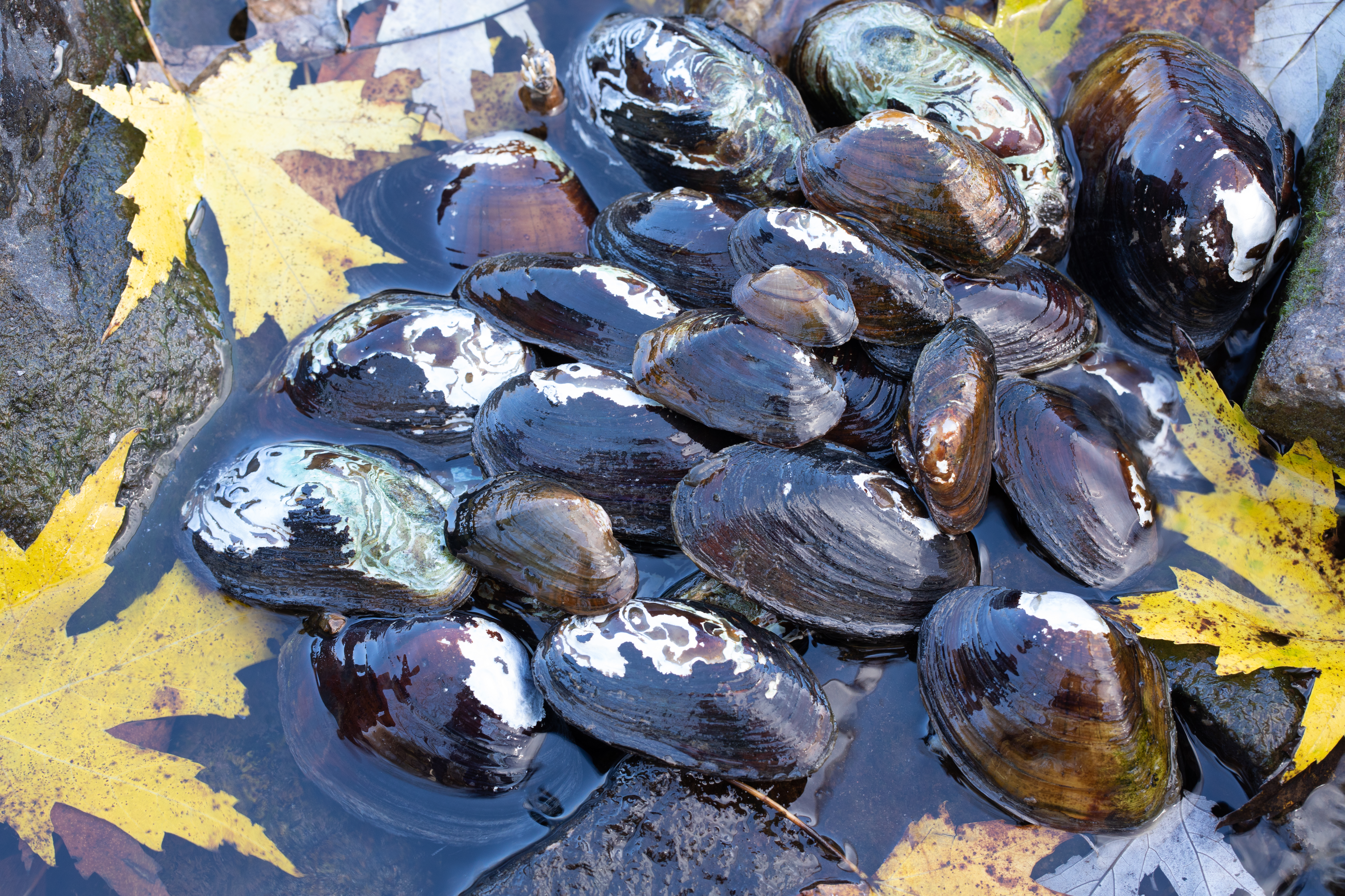 Various freshwater mussels in Cacapon River. Endangered and/or threatened species. Brook Floater; Eastern elliptio; Elliptio complanata; Alasmidonta varicosa; Elliptio fisheriana; Lampsilis cardium; Lasmigona subviridis;