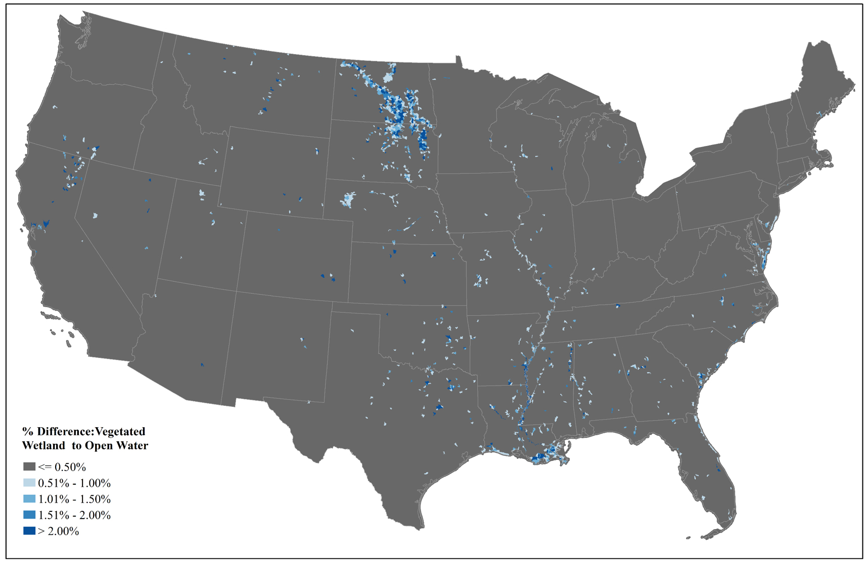 Vegetated Wetland to Open Water Difference Product for HUC12 watersheds in the contiguous U.S. Watersheds with ≤0.5% of vegetated wetland to open water difference, calculated by area, are displayed in gray, while those that have greater than 2% of difference are displayed in dark blue. Patterns are largely controlled by the age of National Wetlands Inventory (NWI) data and land cover trends, including the conversion of drier-end vegetated wetlands to open water via natural and anthropogenic forces. Areas exhibiting the greatest amount of difference (i.e., change) include the Prairie Pothole Region and the Mississippi River Floodplain and Delta. Geographies with the greatest levels of difference could be prioritized for NWI updates.
