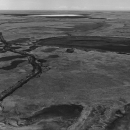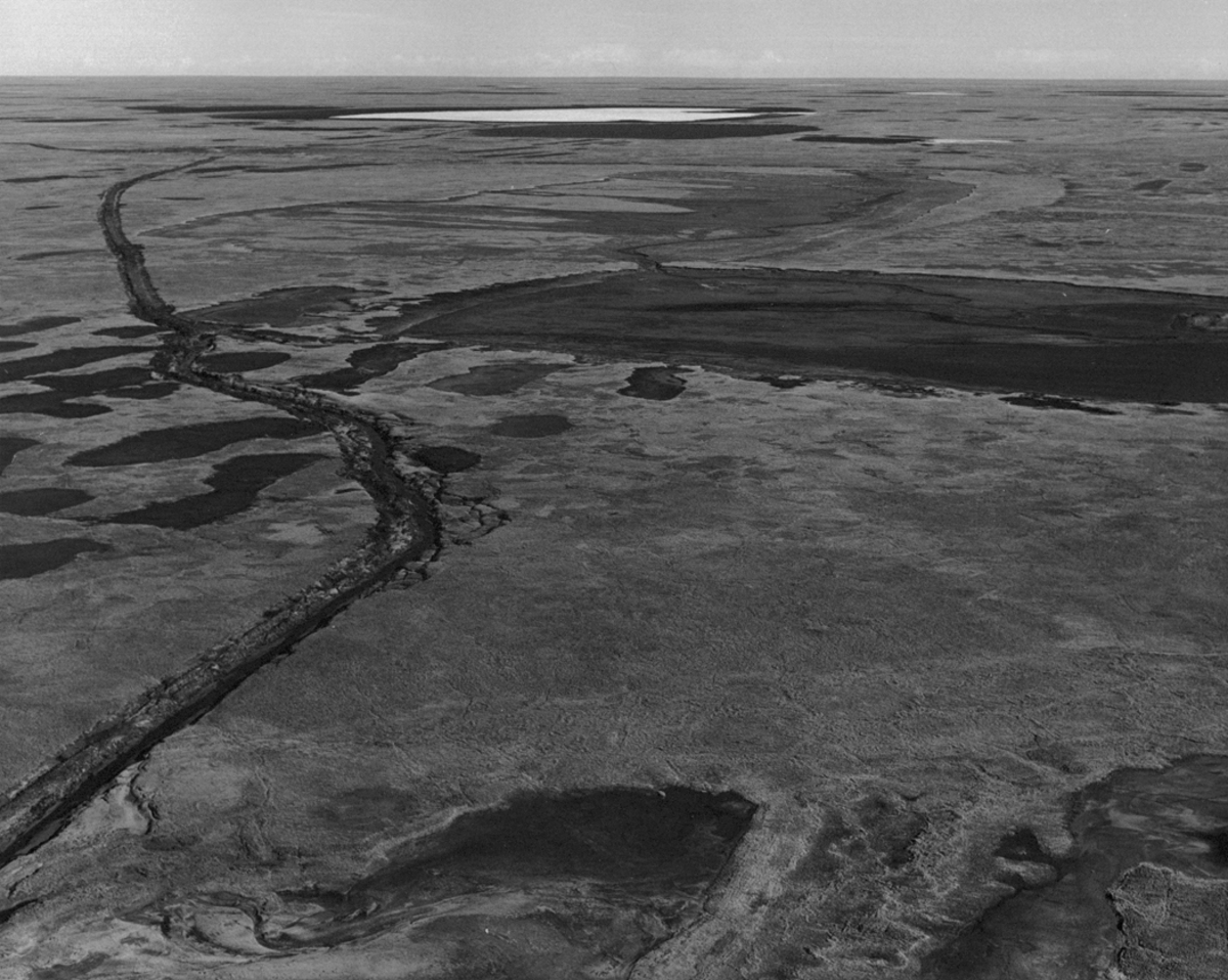 Aerial view. This channel was created by movement of vehicles during thaw season and has already drained several lakes east of Colville River Delta; vehicular damage on North Slope. Industries; Oil Production; TAPS;Trans-Alaska Pipeline; ARLIS; Alaska; FWS-234