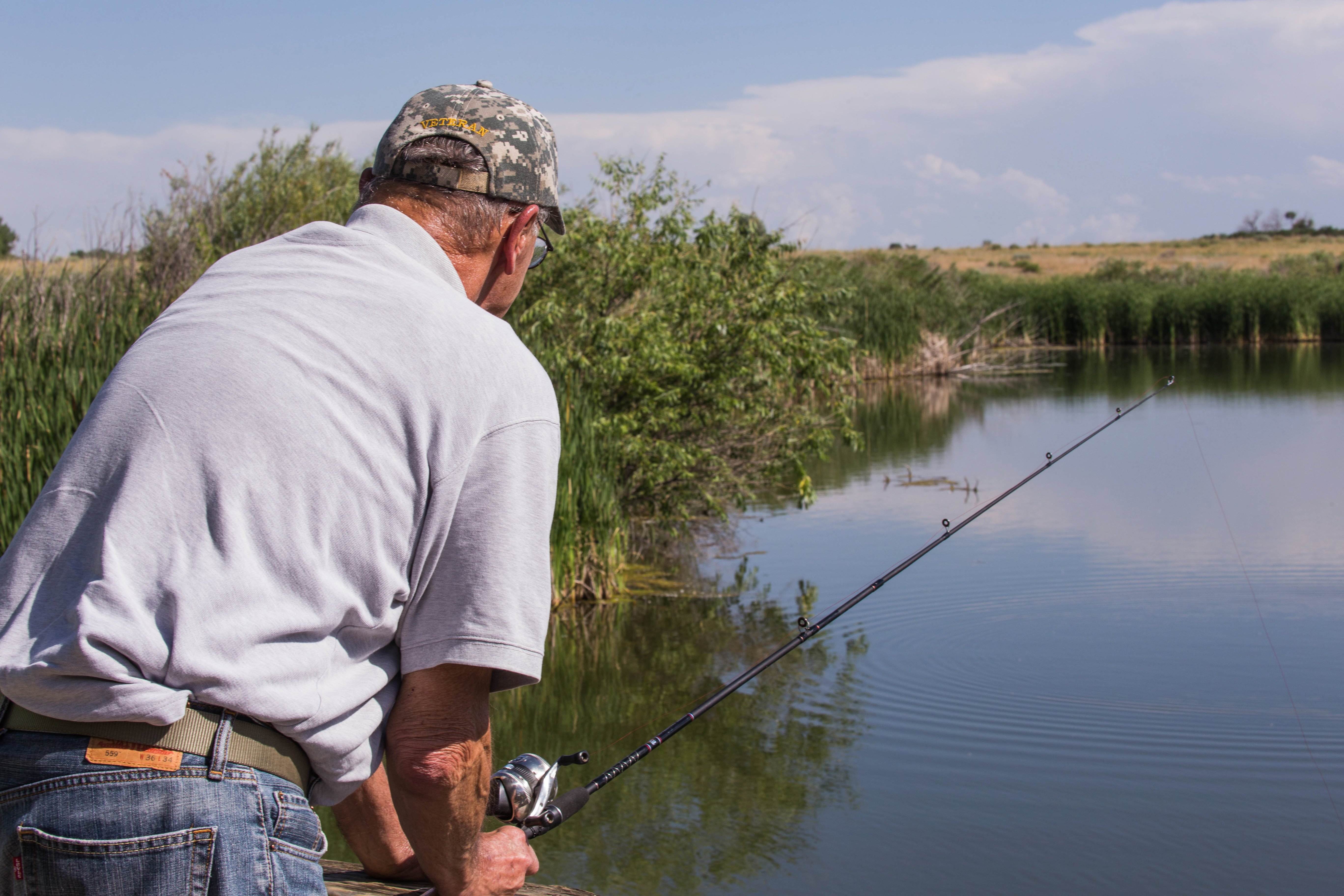 Veterans enjoy day by the lake fishing. Adaptive fishing program for Veterans at Rocky Mountain Arsenal NWR.