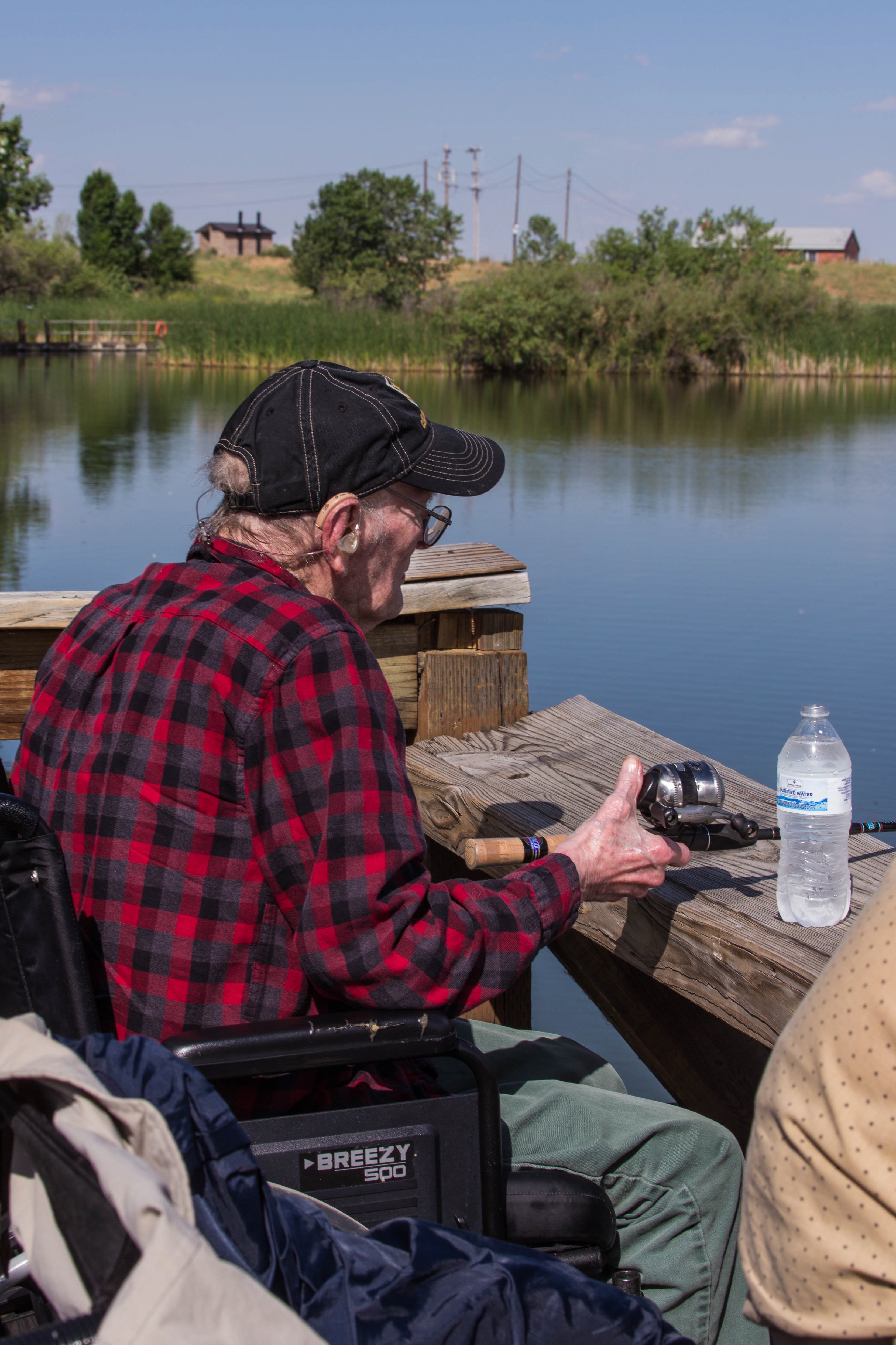 Veterans enjoy day by the lake fishing. Adaptive fishing program for Veterans at Rocky Mountain Arsenal NWR.
