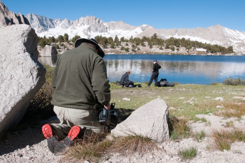 Videographer films biologists. Center Basin, Kings Canyon National Park