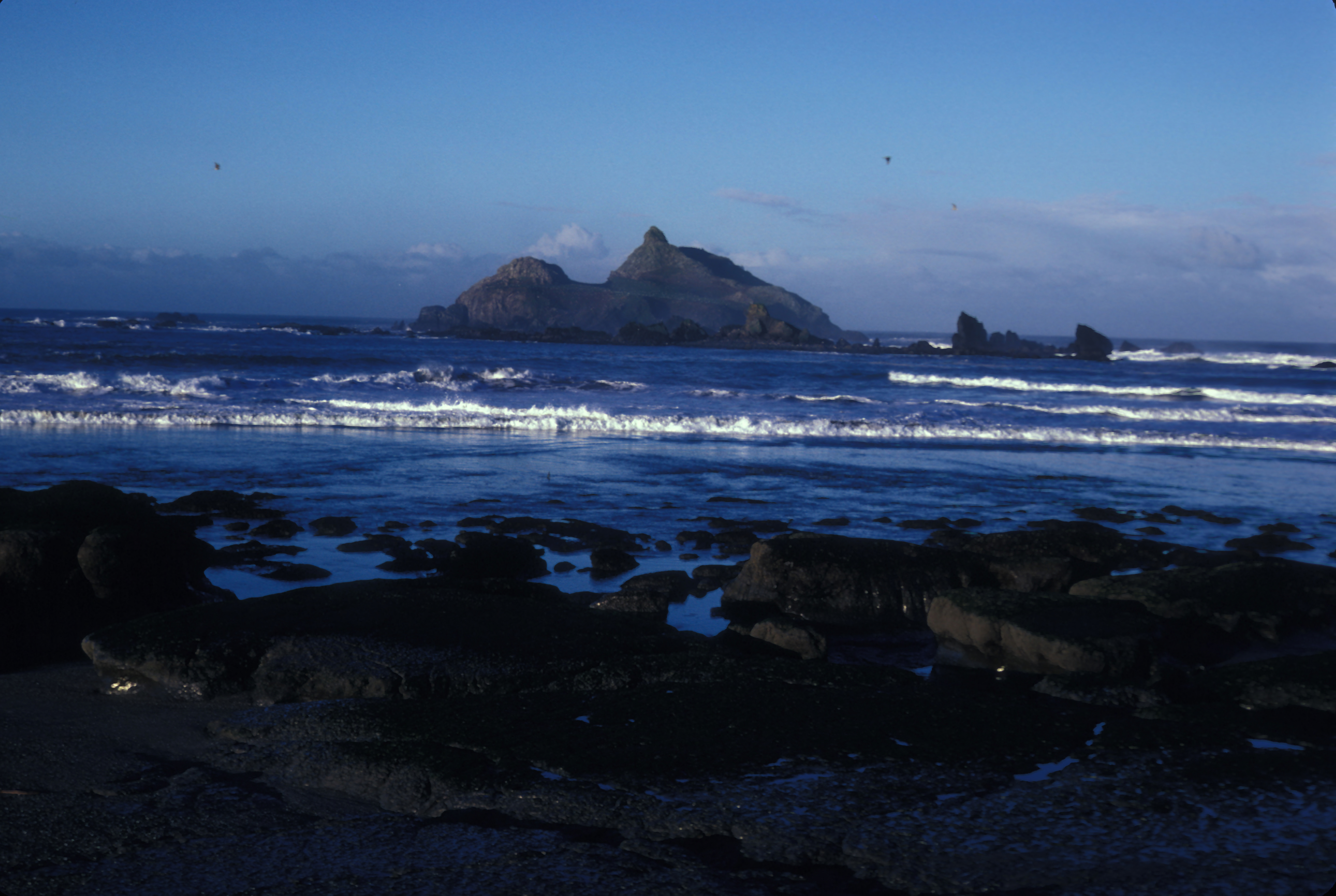 View of Castle Rock National Wildlife Refuge from a mainland California beach