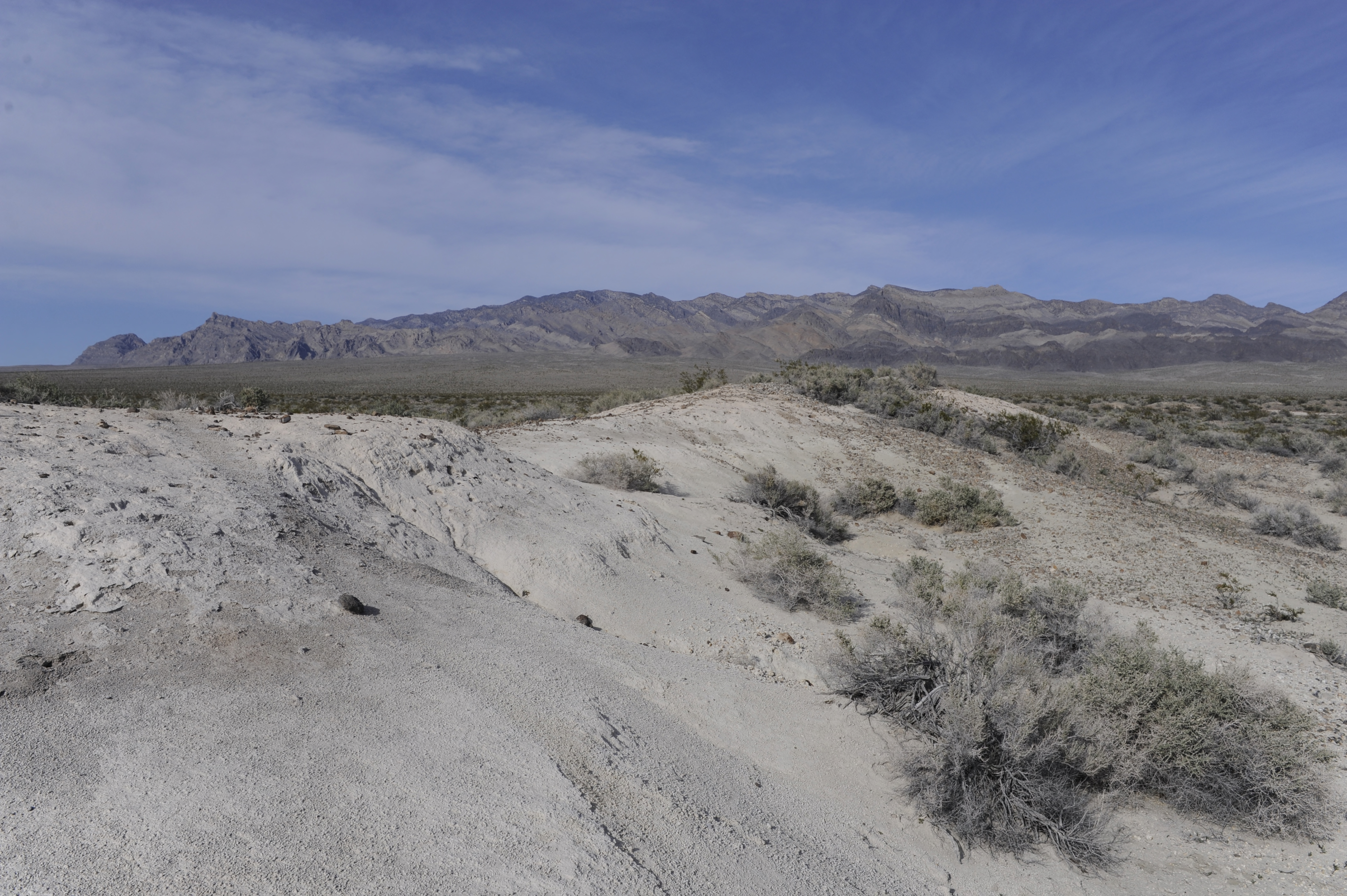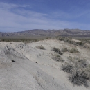 A view of the desert with sand dunes in the foreground and mountains in the background on the Desert National Wildlife Refuge
