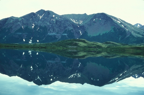 Scenic view of Togiak Lake with mountains in background and reflected in water