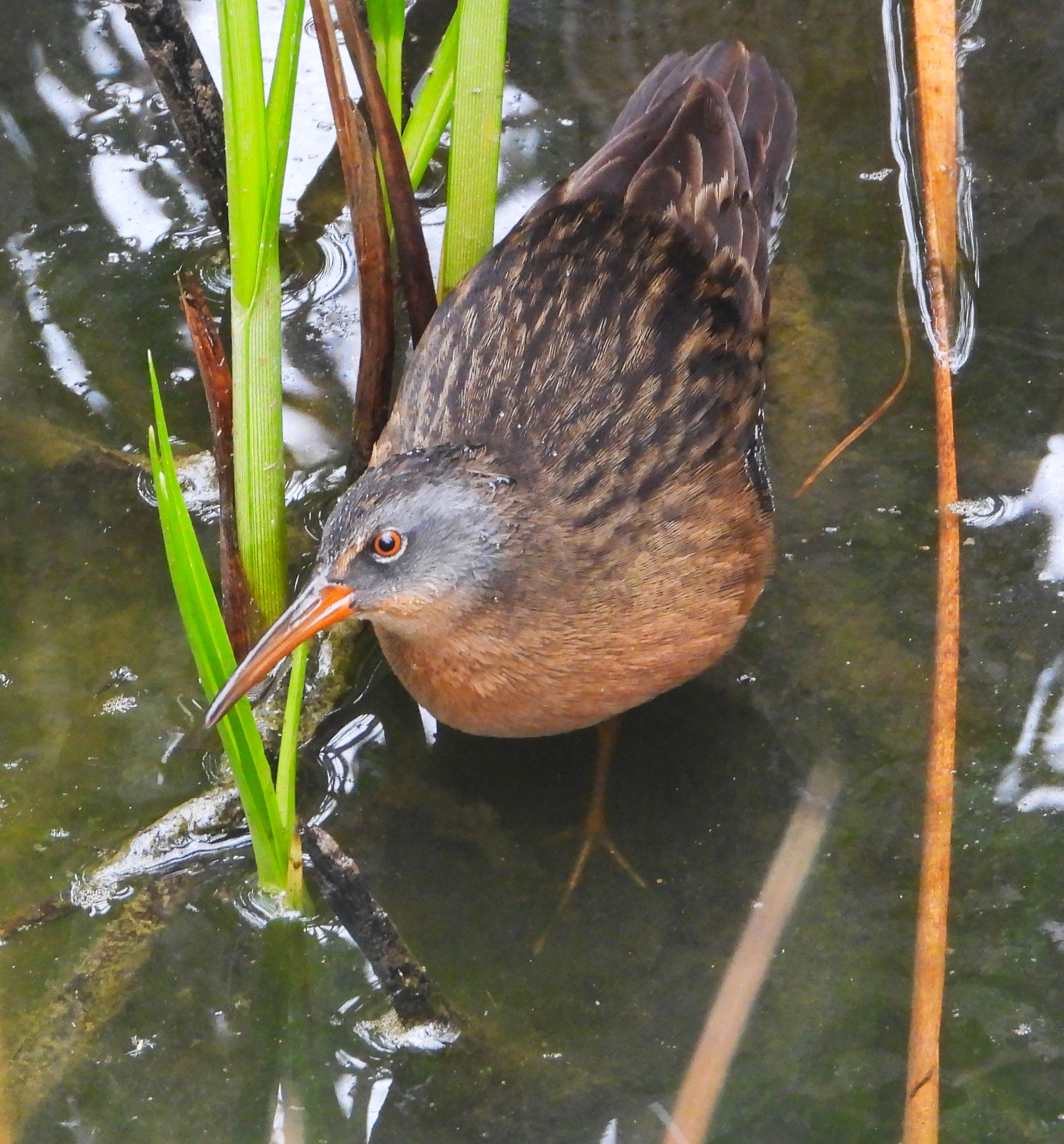 A Virginia rail stands in shallow water surrounded by vegetation.