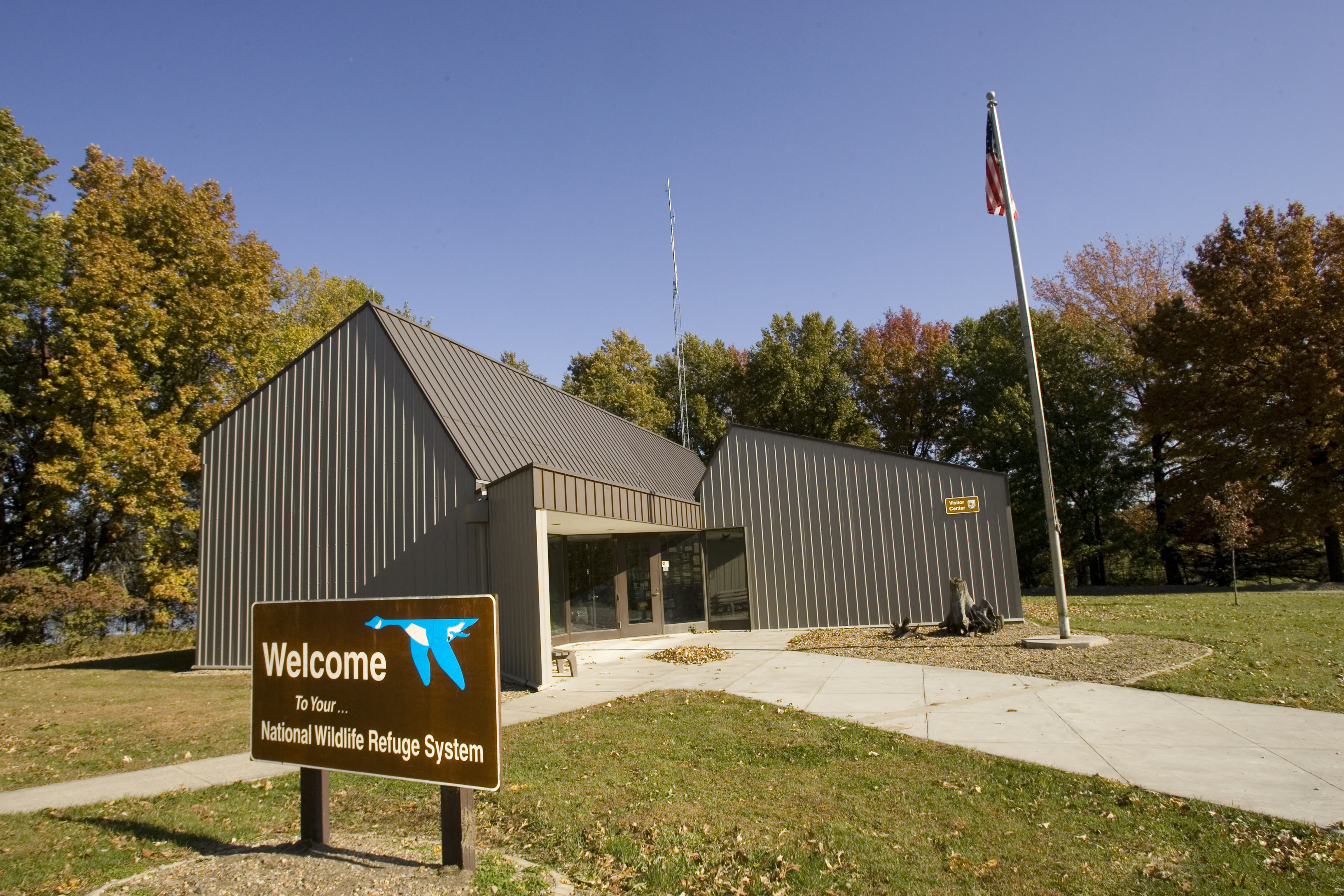 Welcome sign and exterior of Visitor Center building at Swan Lake NWR.