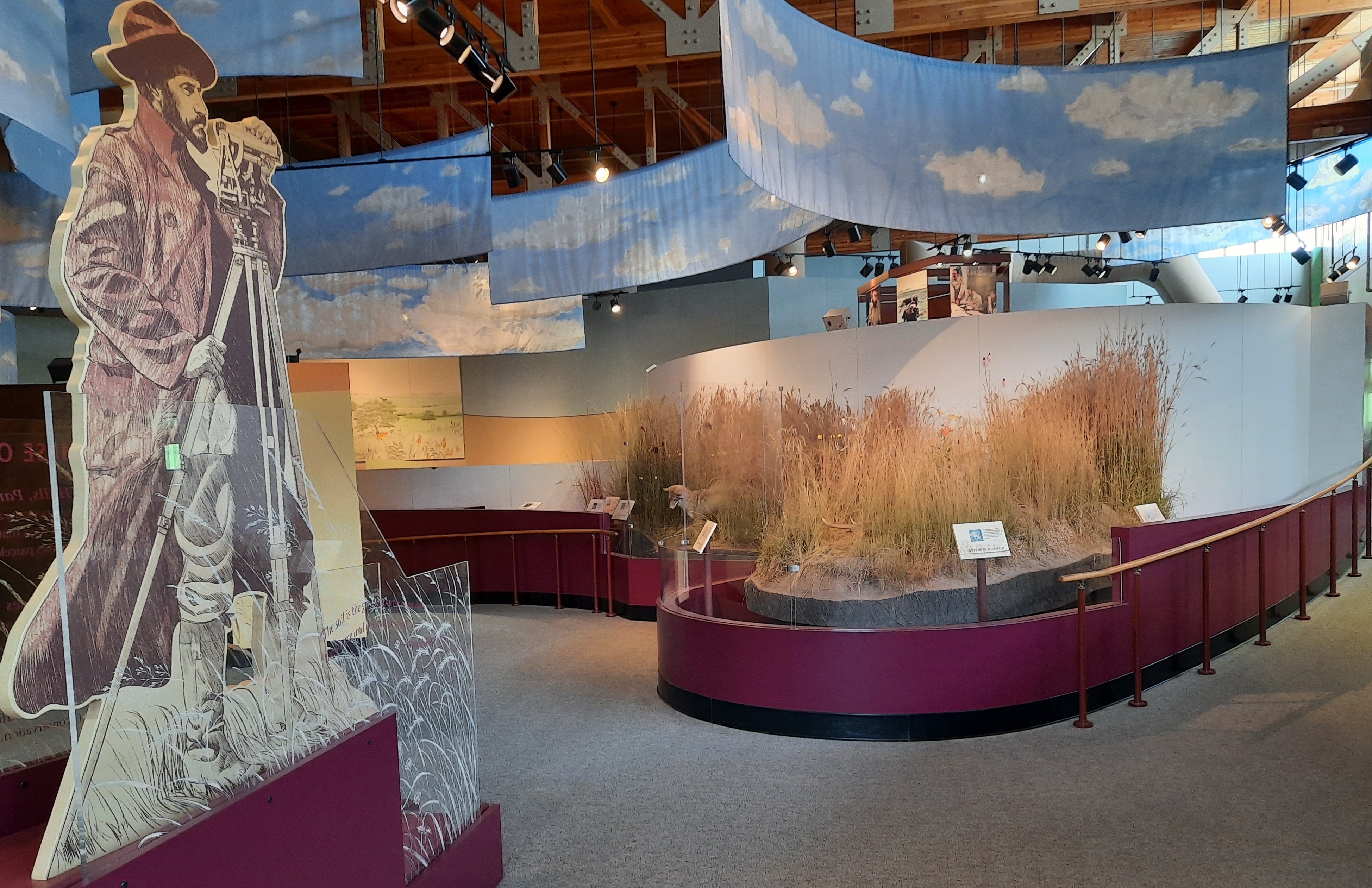 Visitor exhibits on prairie grass and explorers at Neal Smith National Wildlife Refuge in Iowa.