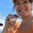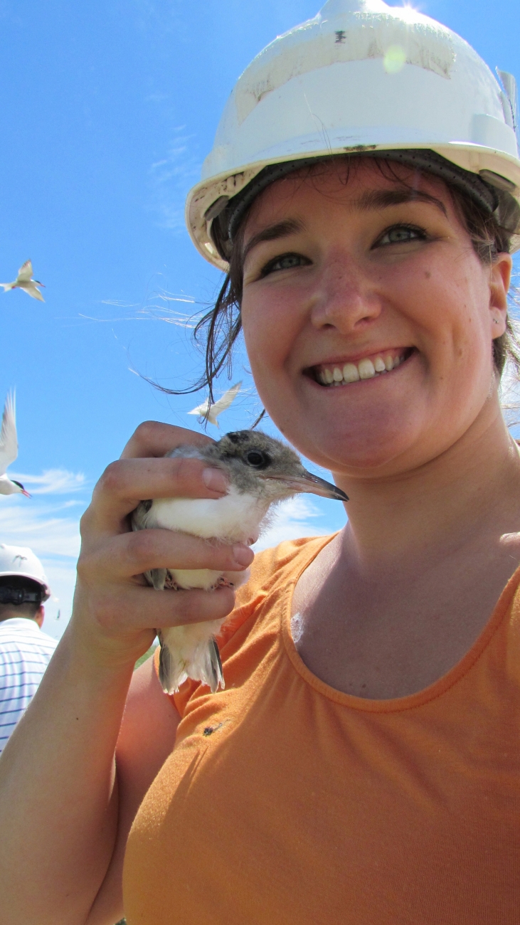 Visitor Services staff member, Chelsi Burns, holds a Common tern chick.