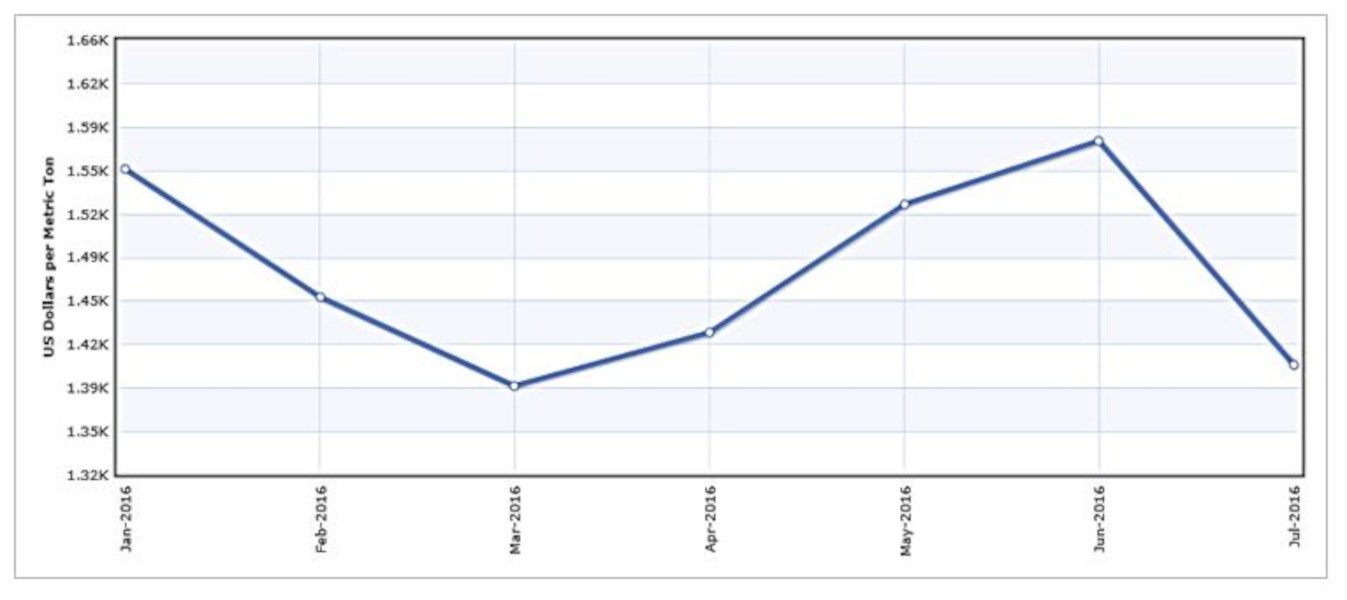 Graph shows the volatile fish meal price from January 2016 to July 2016.