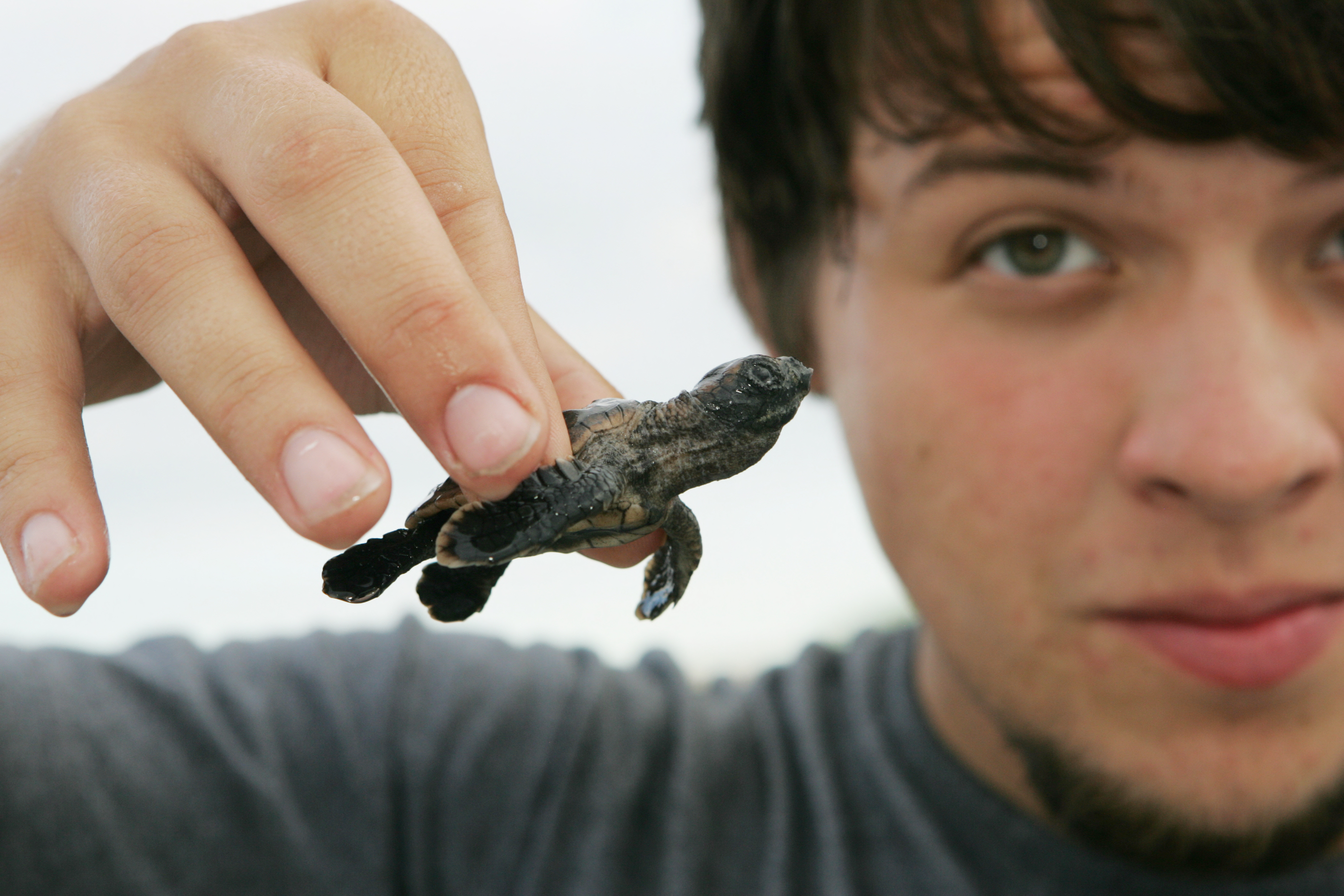 Volunteer helps inventory a nest of hatched turtles in order to determine productivity. This hatchling was found in the nest - it did not get out on its own. It was taken to the water due to the heat of the day and to protect it from being spotted and eaten by sea gulls.