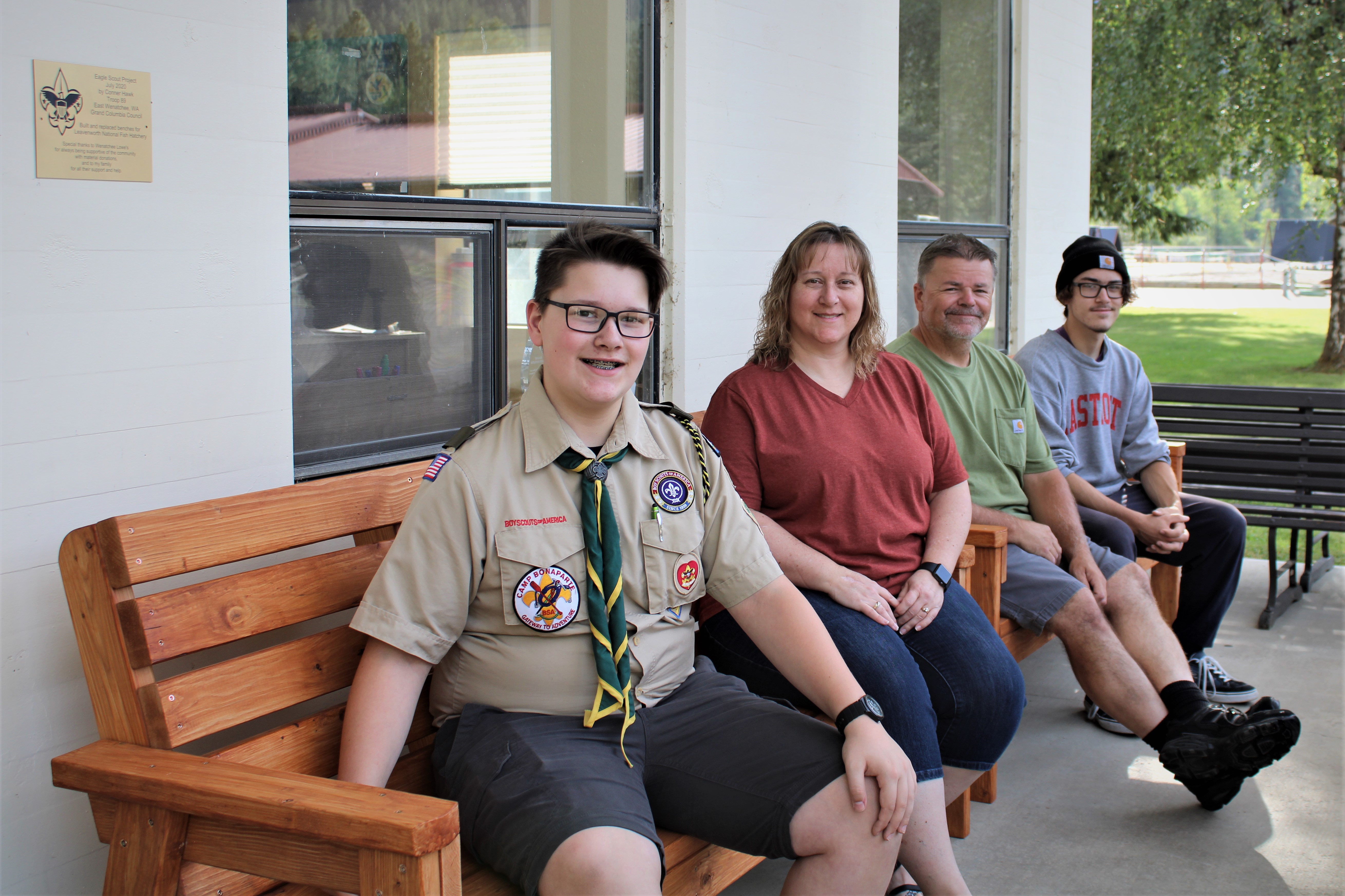 Boy scout Connor Hawk and his family pose on the wooden benches he made for Leavenworth NFH durin the summer of 2020.