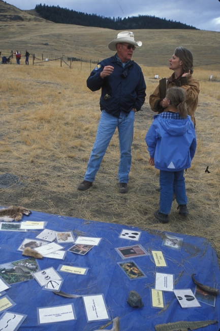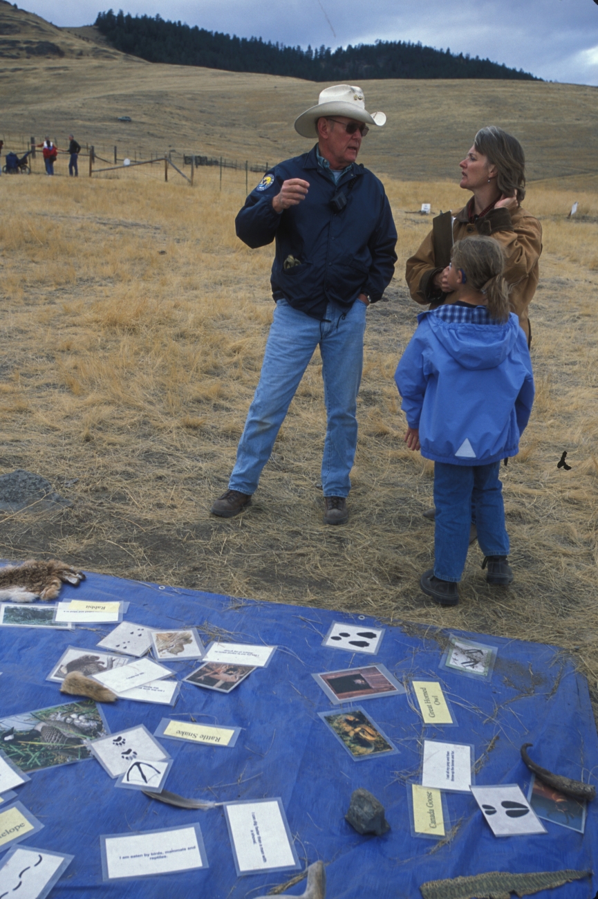 A U.S. Fish and Wildlife Service volunteer talks with visitors at the National Bison Range located in Montana.